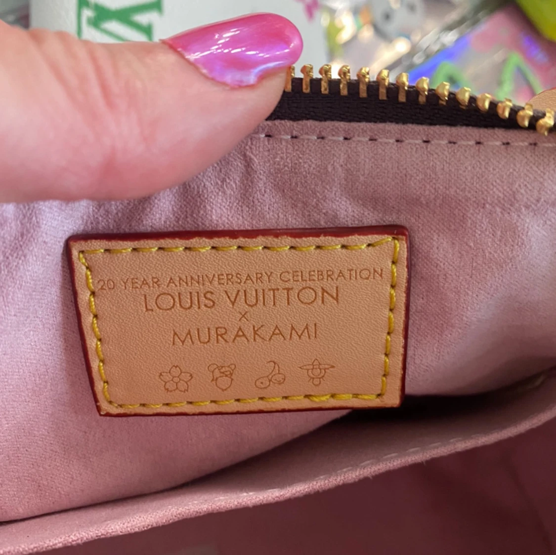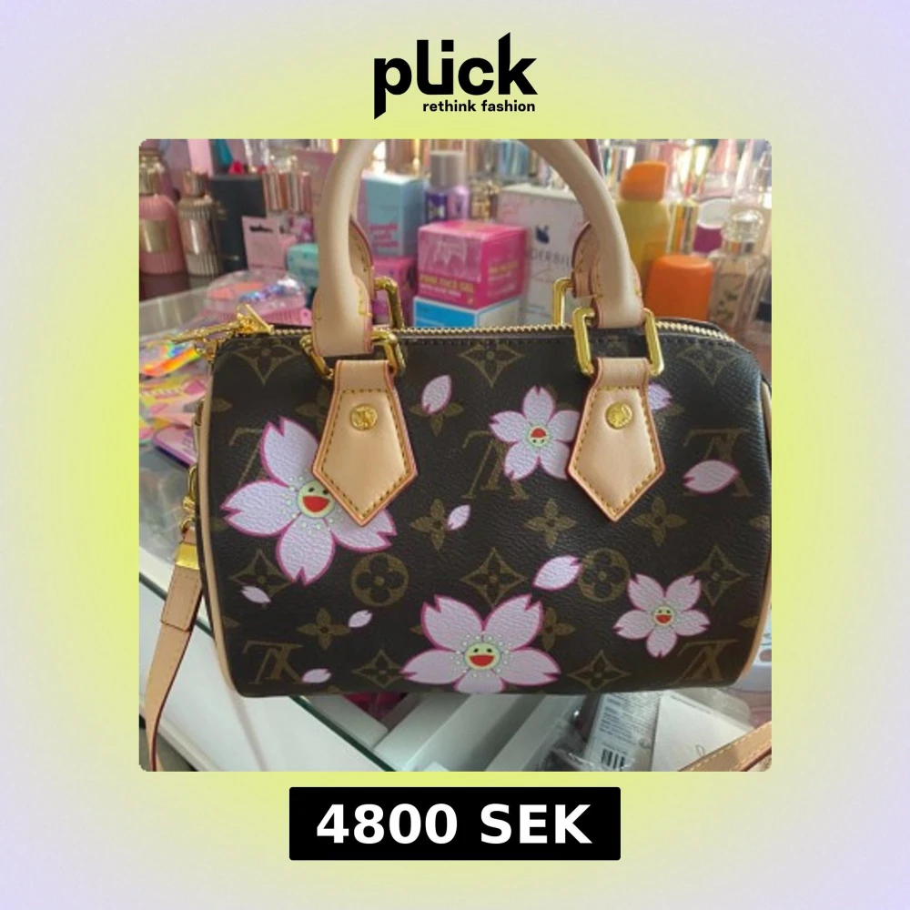 Superfin handväska från Louis Vuitton x Murakami 20th Anniversary med ikoniskt monogram och rosa-blommigt mönster. Väskan har ljusa handtag, guldfärgade detaljer och dragkedja. Insidan är fodrad i rosa tyg och har exklusiv märkning.