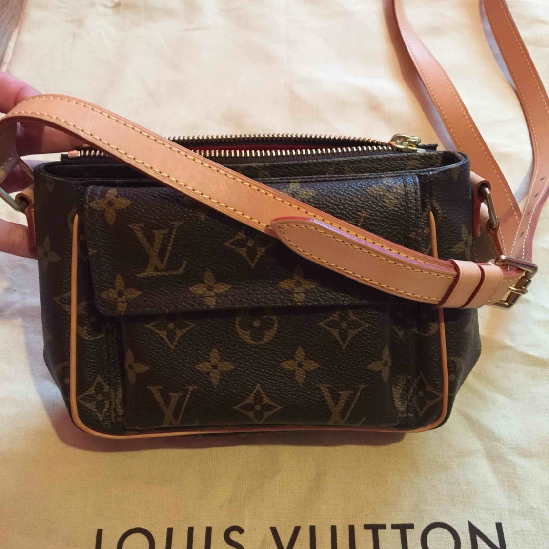 Louis Vuitton Viva Cite PM Cross-Body Bag. Monogram, natural cowhide, adjustable-strap, front snapped pocket and red alcantara lining. Measures 7" x 6" x 4". Authentic with proof of purchase. Made in Spain. Very clean, near perfect condition. dust cover.