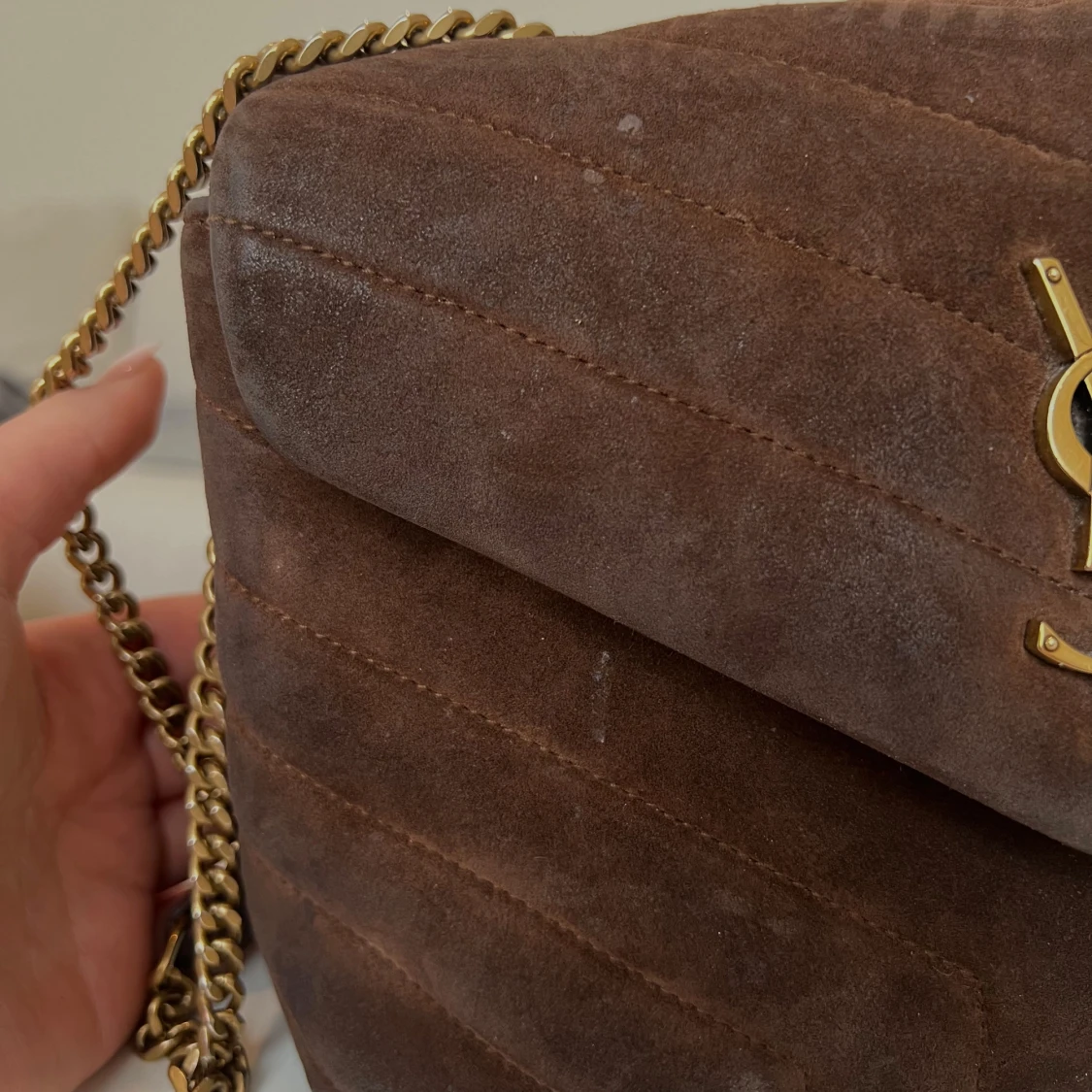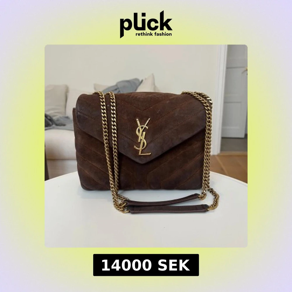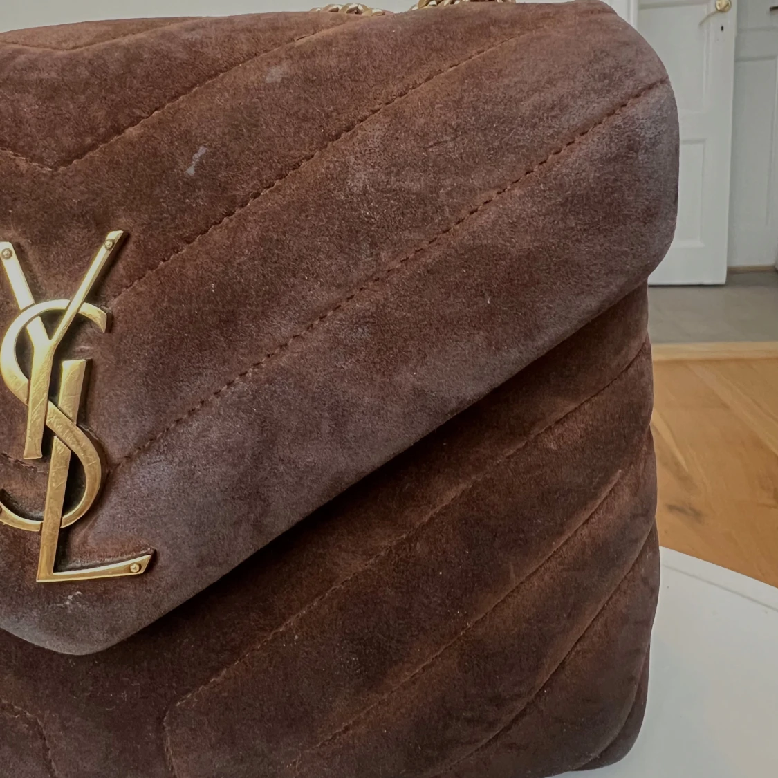 Intressekoll på min fantastiska YSL Lou Lou bag i brun mocka. Väskan har vissa spår av användning, främst i form av fläckar på mocka. Den har aldrig rengjorts, men mocka är ett material som oftast går att fräscha upp relativt enkelt, vilket gör att väskan har stor potential att återställas till mycket fint skick. Perfekt till hösten🤎🤎 Bredd: 25cm Höjd: 17cm Djup: 9cm. Har självklart äkthetsbevis! Kan mötas upp i Stockholm