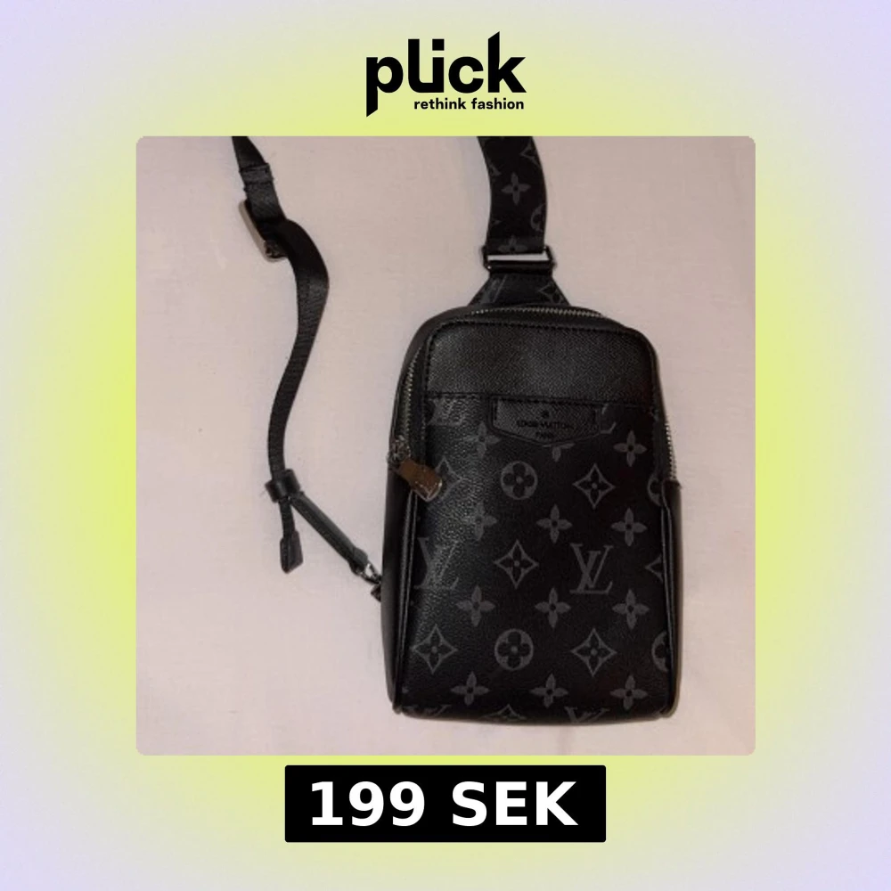 Säljer en svart axelväska med klassiskt monogrammönster. Väskan har justerbar rem, silverfärgade dragkedjor och är tillverkad i skinn. Perfekt storlek för mobilen och andra småsaker, och ger en lyxig vibe till din outfit.