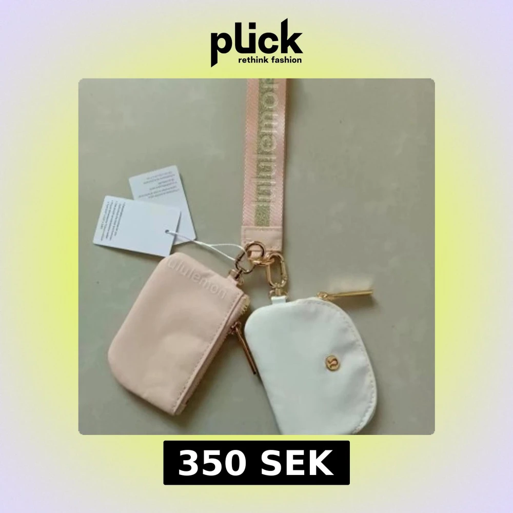 Säljer ett set med två små plånböcker från Lululemon, en i ljusrosa och en i vit, båda med silverfärgade dragkedjor och logga. De sitter ihop med en bred, rosa handledsrem och metallkedjor. Perfekt för kort, mynt eller småsaker.