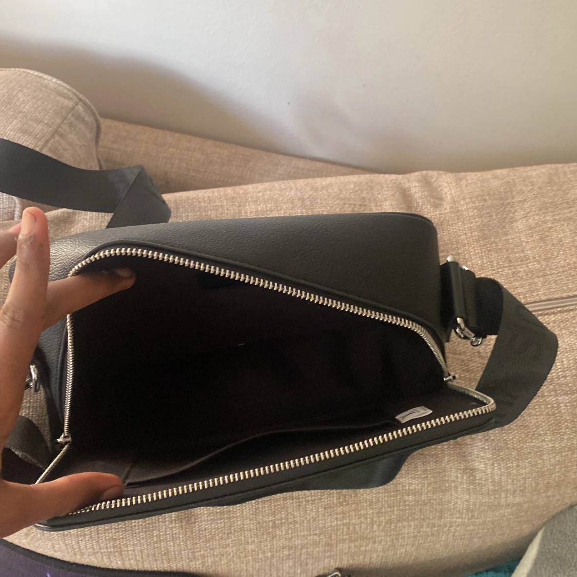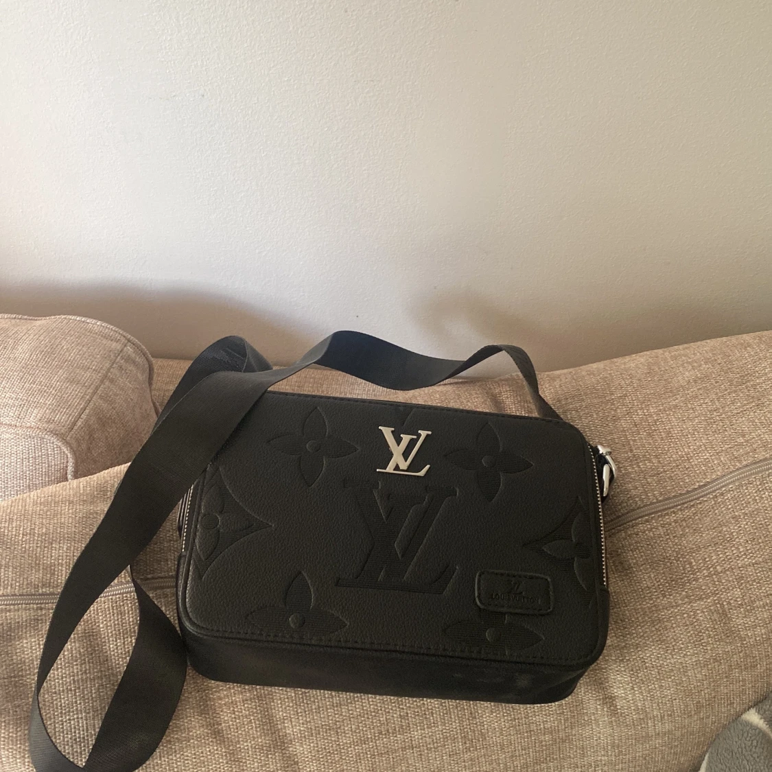 Säljer en svart axelväska från Louis Vuitton i skinn med präglat monogrammönster och silverfärgad LV-logga framtill. Väskan har justerbar axelrem och dragkedja upptill. Perfekt storlek för det viktigaste och riktigt snygg att bära crossbody.
