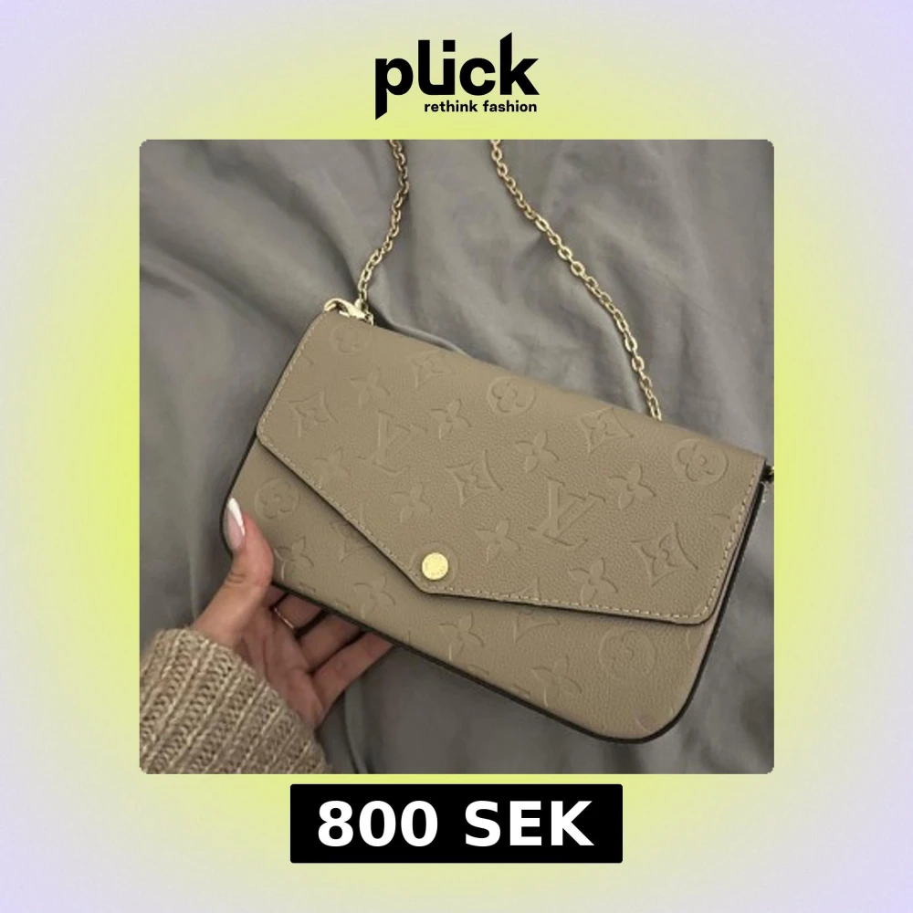 Säljer denna supersnygga axelväska i beige med elegant präglat mönster och guldfärgad kedjerem. Väskan har kuvertdesign med tryckknapp, och är tillverkad i ett strukturmönstrat material som ger en exklusiv känsla. Plånbok ingår, se sista bild. Aldrig använd!