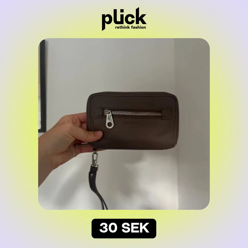 En kompakt brun plånbok med dragkedja och avtagbar handledsrem. Plånboken har flera fack för kort och en liten ficka med dragkedja inuti.