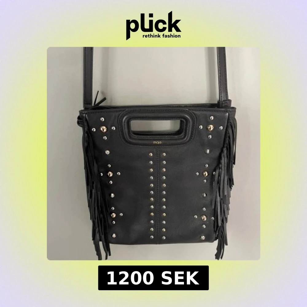 Svart axelremsväska från Maje i läder med fransar på sidorna och guld/silver färgade nitar framtill.