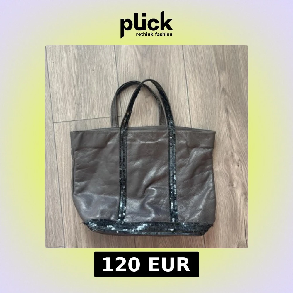 Stor grå handväska från Vanessa Bruno i äkta skinn med svarta paljetter längs handtag och botten. Väskan har innerficka med dragkedja och rymligt fack. Perfekt för dig som gillar en stilren look med lite extra bling.