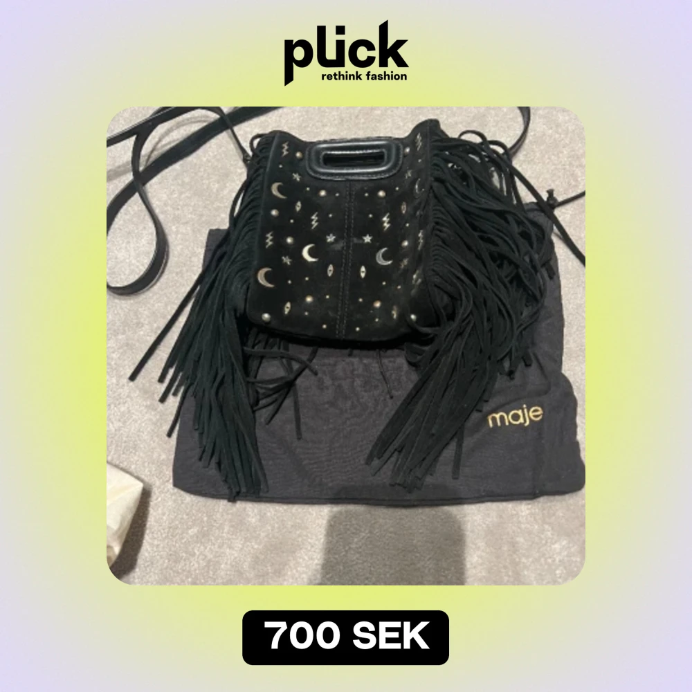 Svart maje väska med långa fransar och guldiga detaljer. Man kan ha den för hand men även över axeln. Pris kan diskuteras
