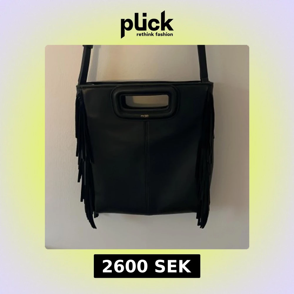 Cool svart axelväska från Maje i skinn med fransar längs sidorna och ett handtag upptill. Väskan har en stilren, fyrkantig form och justerbar axelrem. Väskan är i nytt skick och köpt på Majes butik i NK.
