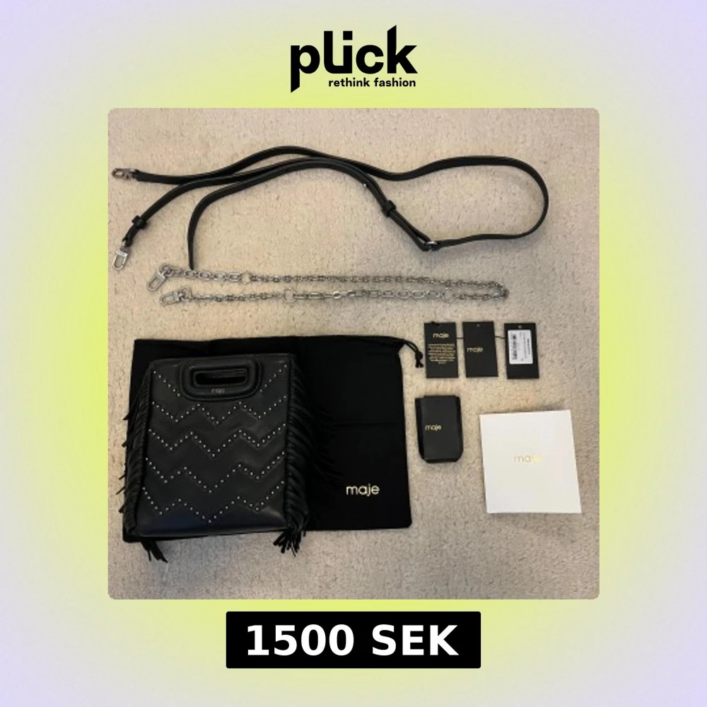 Maje väska med studds i ett zick-zack mönster som är köpt hösten 2021 i marbella. Väskan köptes för 250 euro som då va runt 2500kr ungifär. Nu kostar en liknande väska runt 3000kr. Väskan kommer med en kedja och ett läderband. Kedjan är aldrig använd men läderbandet och delarna på väskan där bandet ska hakas fast har lite rost som inte syns när väskan används. Längst ner på väskan finns et litet rivmärke på cirka 2 cm som bara syns i speciella ljus. Annars i väskan i toppskick!