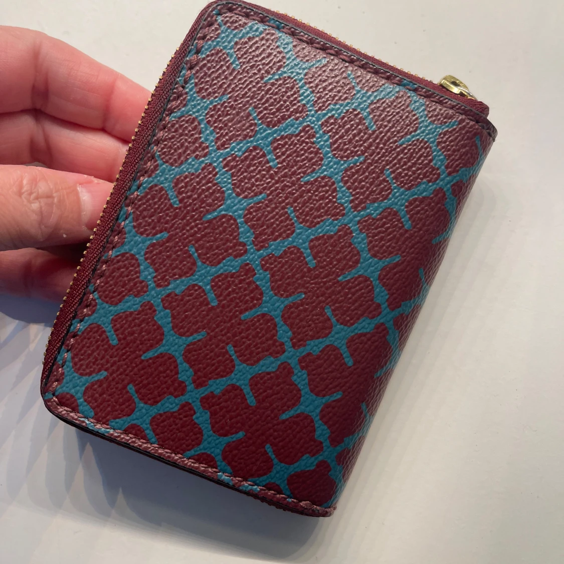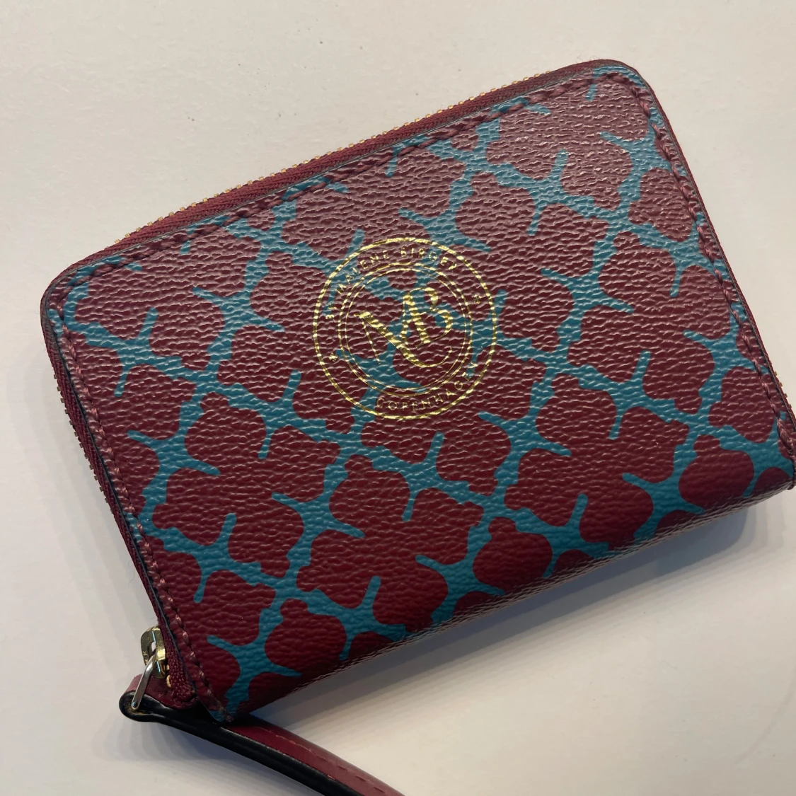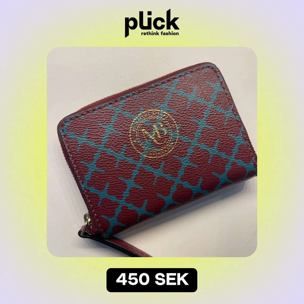 Säljer en snygg plånbok i mycket bra skick med ett unikt mönster i rött och blått. Plånboken har en praktisk dragkedja och är perfekt för att hålla ordning på kort och kontanter. Den är kompakt och lätt att ta med sig överallt. Frakt betalar av köparen.