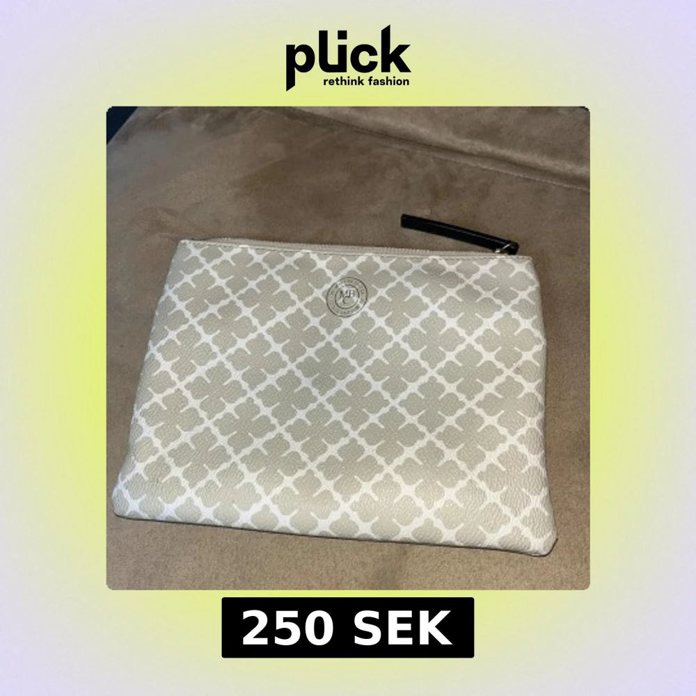 Snygg beige kuvertväska med ett elegant rutigt mönster och dragkedja. Perfekt för att hålla dina småsaker organiserade med stil. Toppen skick och är köpt från Malene Birgers hemsida.