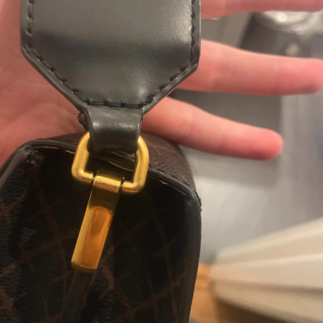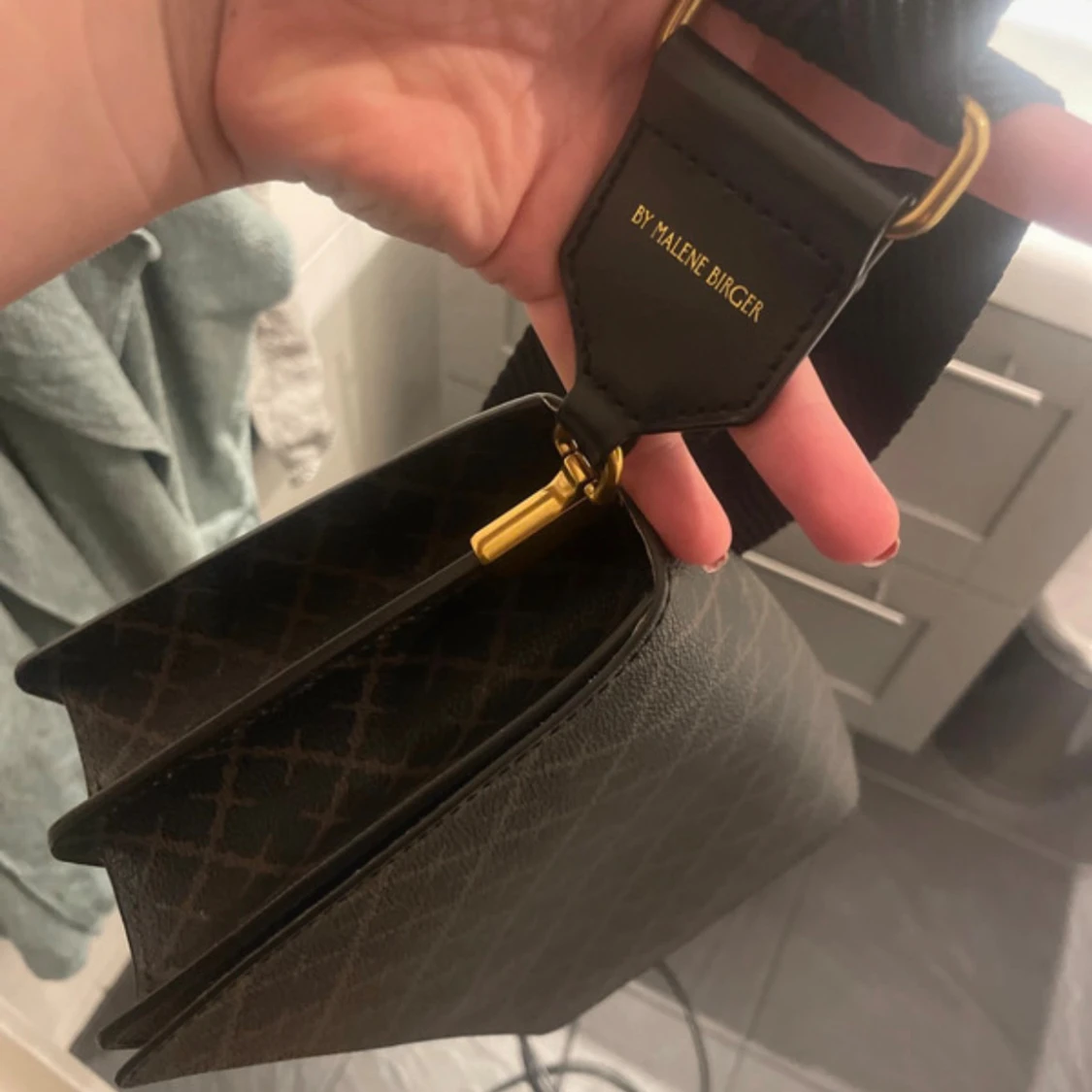 Snygg axelväska från By Malene Birger i mörkbrunt och svart med rutigt mönster. Väskan har bred axelrem med gulddetaljer och flera fack för smart organisering. Tillverkad i skinn material och perfekt för dig som vill ha en trendig och stilren look.