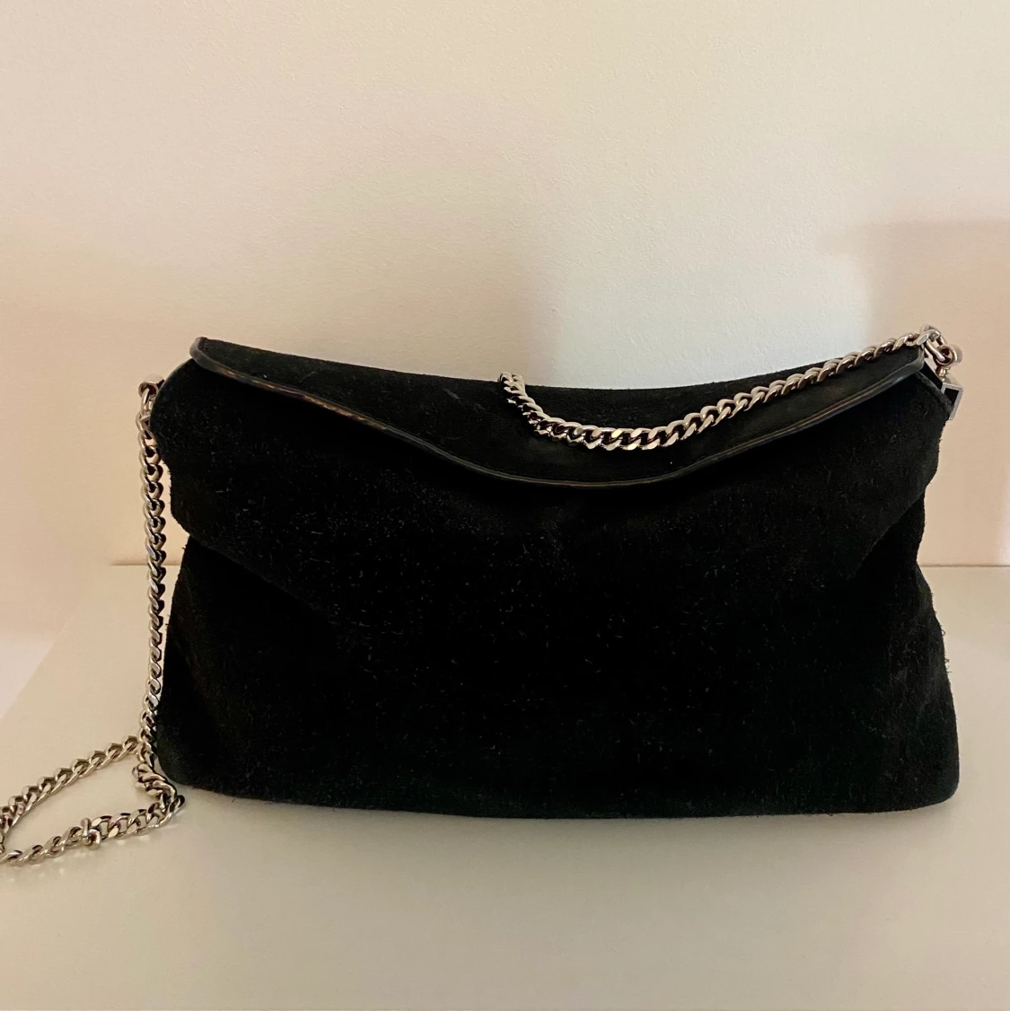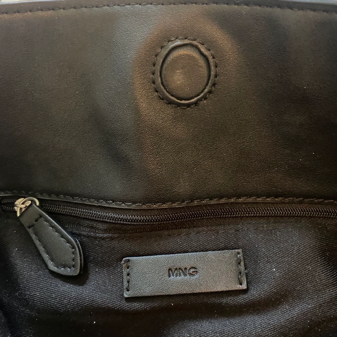 Svart handväska i Mocca med silvrig kedjerem. Köpt från Mango, inköpspris 399kr. Innerficka med dragkedja. Rymlig och fin väska som är varsamt använd. Mått ca: L30cm, B 10cm, H 15cm Material: 95% Bovine leather, 5% Polyuretan Innerfoder: 100% polyester