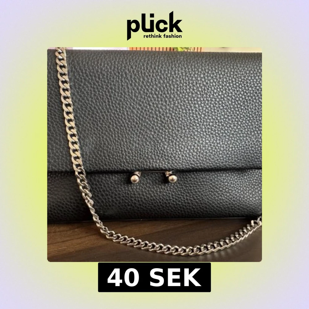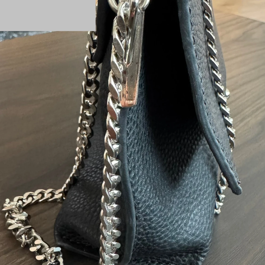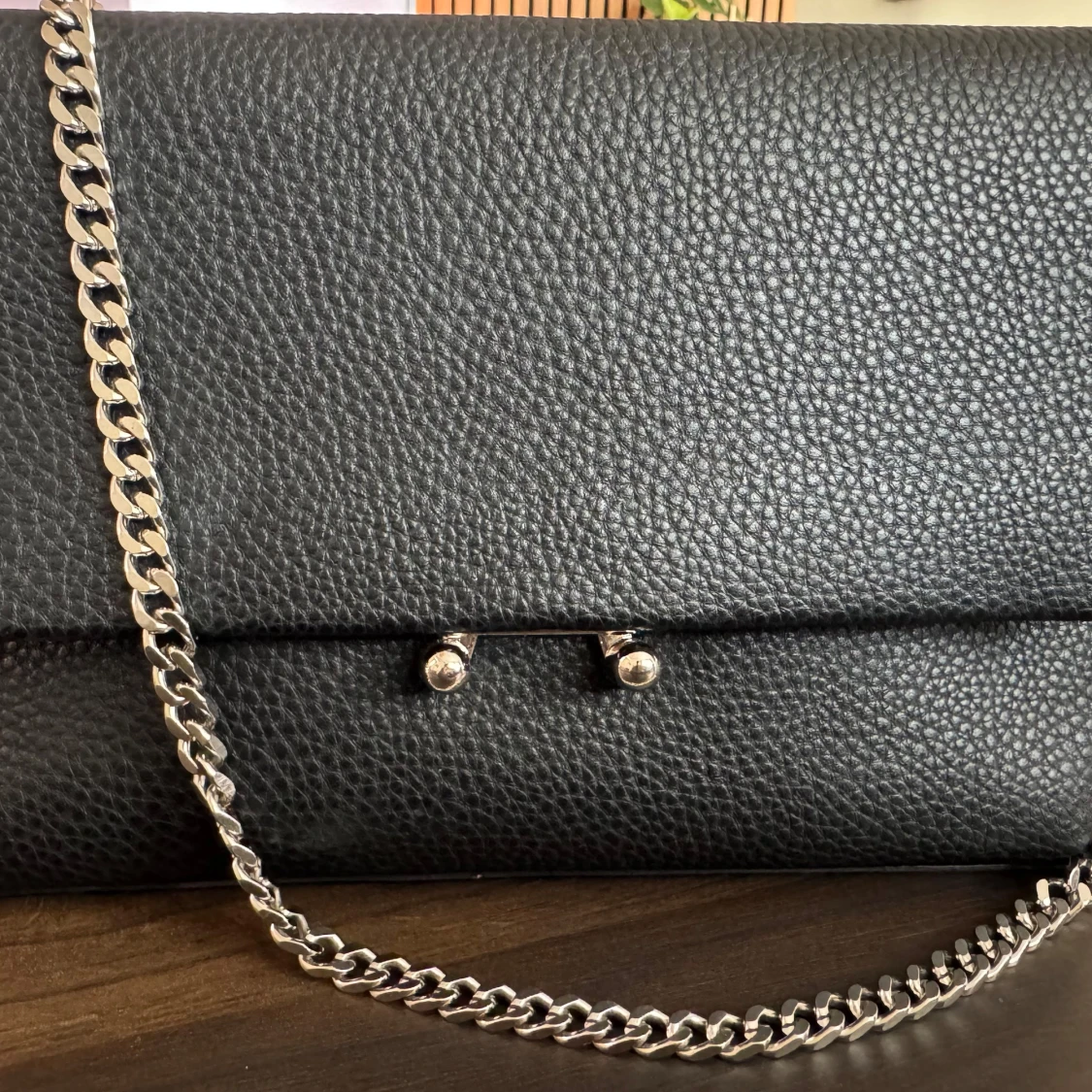 Snygg svart axelväska i skinn med silverfärgad kedja som axelrem. Väskan har en stilren design med en strukturerad yta och metallknappar framtill. Perfekt för att ge en elegant touch till din outfit.