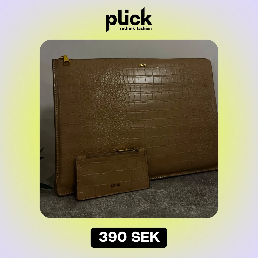 Snygg beige datorväska och matchande plånbok från Mango i krokodilpräglat mönster. Fodralet har en dragkedja upptill och är perfekt för att bära din laptop med stil. Plånboken är liten och smidig, perfekt för kort och kontanter. Perfekt set för en chic och organiserad look!