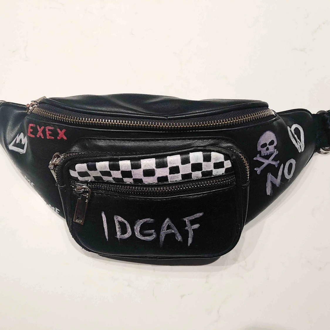 Omdesignad beltbag i fakeskinn. Målad med reflex. Rymlig och bekväm. Anpassningsbart bälte. Gjord av UF-företaget Ex Animo UF.