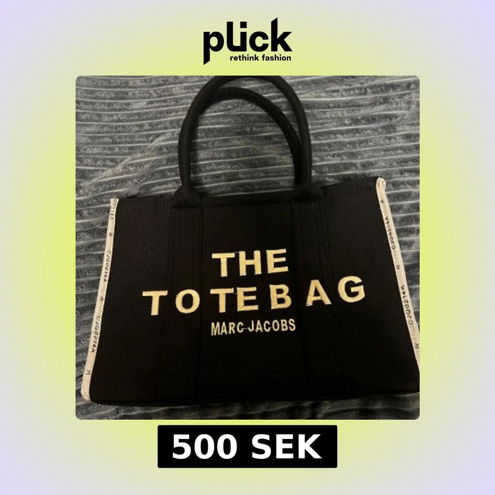 Säljer en svart tote bag från Marc Jacobs med tydlig logga framtill och cool textdetalj på baksidan, har både handtag och axelrem med Marc Jacobs-tryck samt dragkedja upptill. Perfekt för dig som vill ha en rymlig och snygg väska.