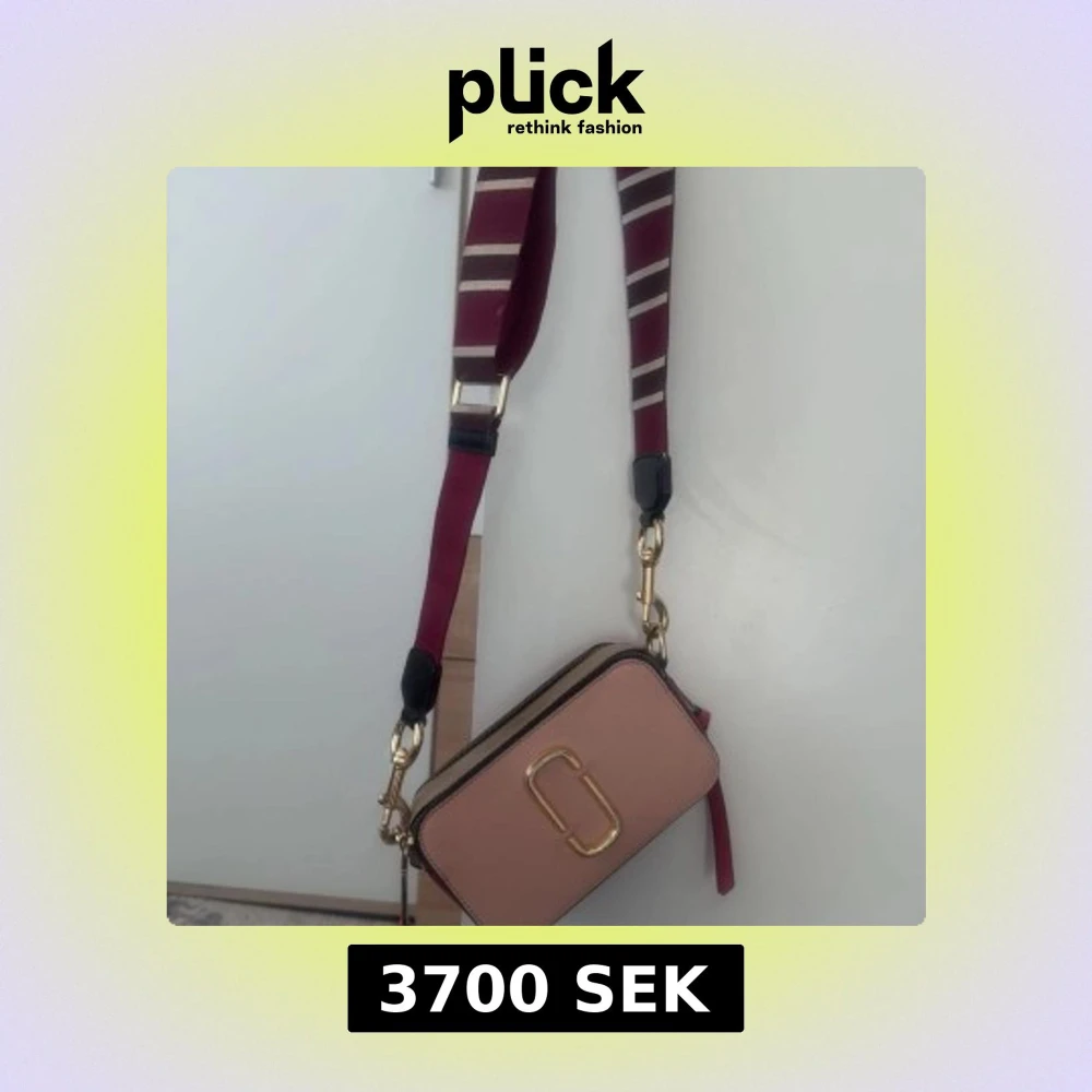 Snygg Marc Jacobs Snapshot axelväska i ljusrosa och beige med guldfärgade detaljer. Väskan har ett brett, randigt axelband i vinrött och beige, samt dubbla dragkedjor och det ikoniska Marc Jacobs-logot på framsidan. Perfekt storlek för mobilen och småsaker.