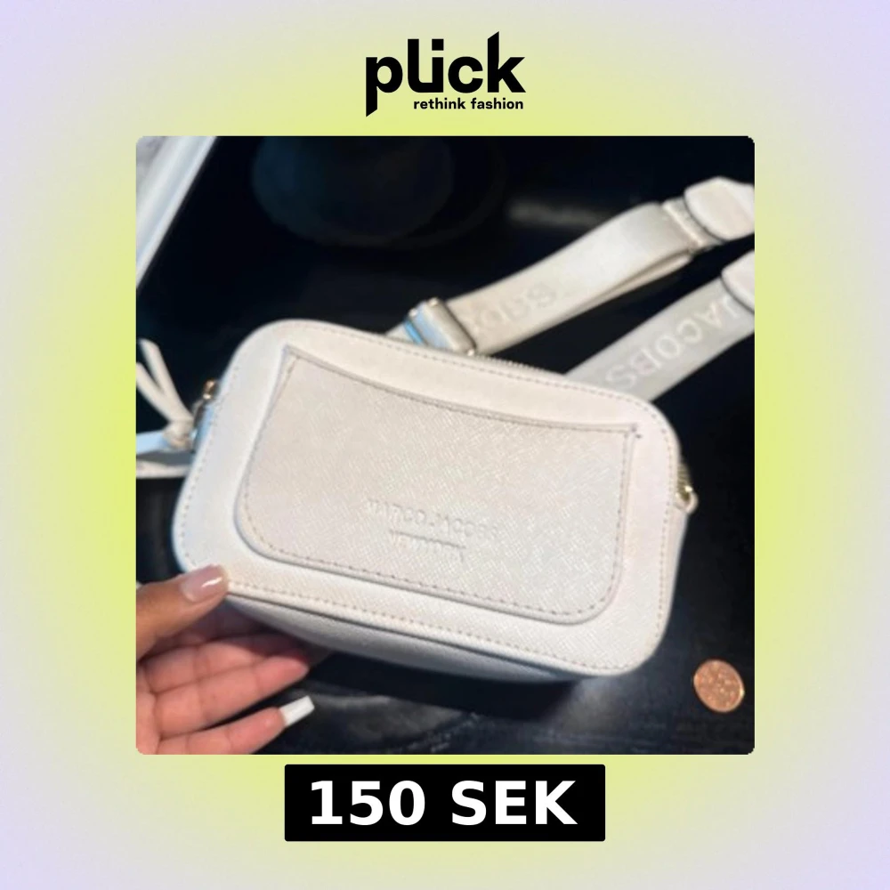 Säljer en stilren vit axelväska från Marc Jacobs med justerbar bred rem och snygga guldfärgade detaljer. Väskan har två dragkedjor upptill och ett stort logospänne framtill. Materialet är strukturerat skinn och designen är kompakt och modern.