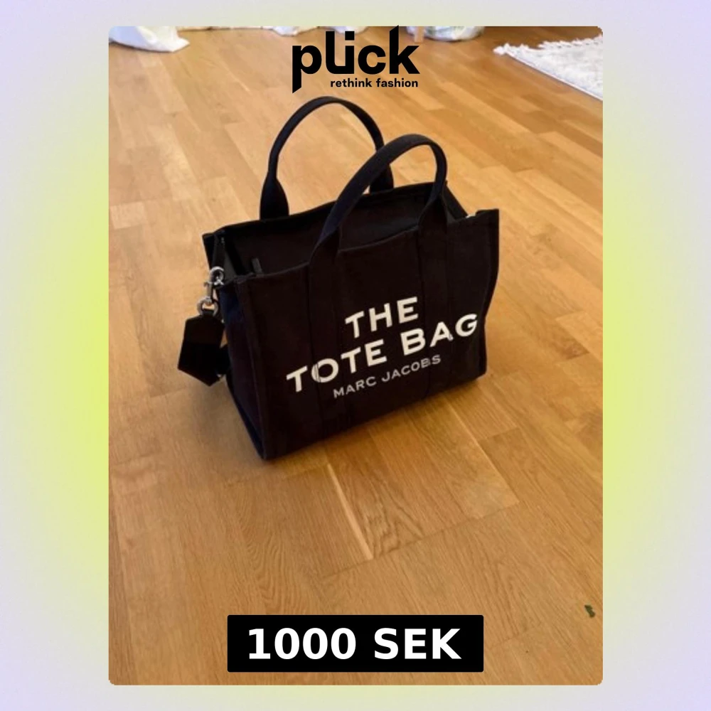 svart tote bag från Marc Jacobs med tydlig vit text på framsidan. Väskan är i canvas, har både handtag och justerbar axelrem samt dragkedja upptill. Perfekt för dig som vill ha en rymlig och snygg väska. Köpt nu detta året och bra skick . 33cm bred 25,5 höjd