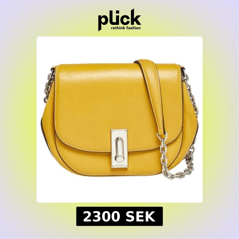 Snygg gul axelväska i skinn med en stilren design. Väskan har en silverfärgad kedja och ett elegant lås framtill.