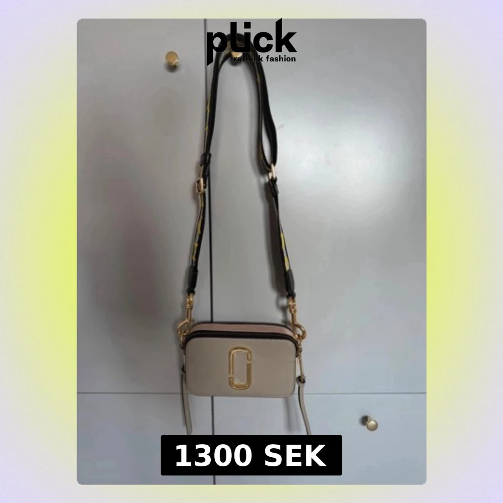 Beige axelväska från Marc Jacobs med guldfärgade detaljer och logotyp framtill. Väskan har en bred, justerbar axelrem med svart, grå och gul text. Två fack med dragkedja och en ficka på baksidan. Sparsamt använd. Lite nagg på märket på framsidan, se bild.