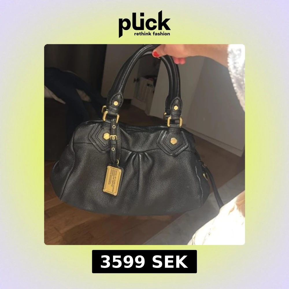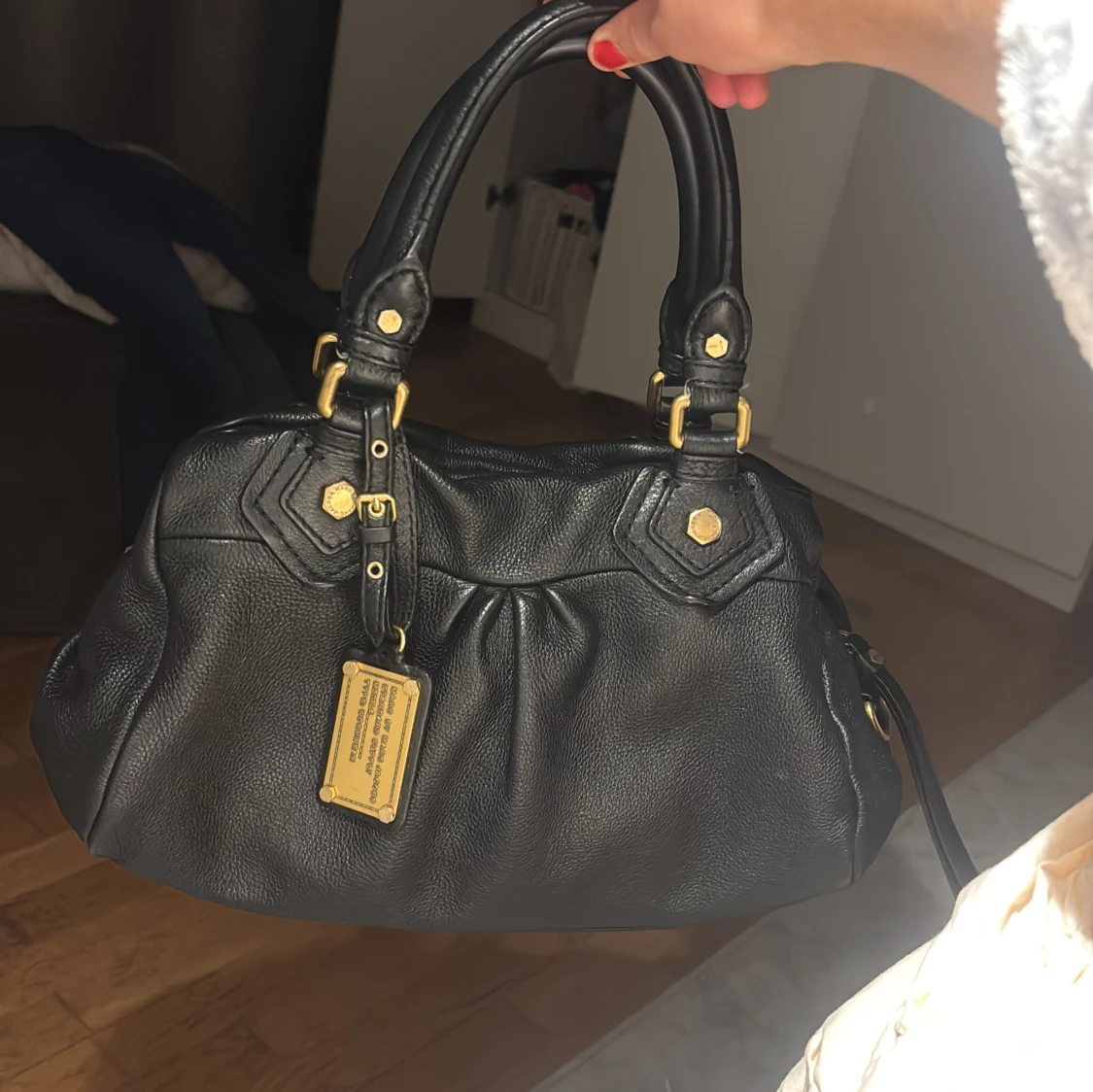 Snygg svart handväska i skinn från Marc by Marc Jacobs med guldfärgade metalldetaljer och dubbla handtag. Väskan har en mjuk, rundad form och en dekorativ metallbricka framtill. Perfekt för dig som gillar klassisk och stilren design. Pris kan diskuteras