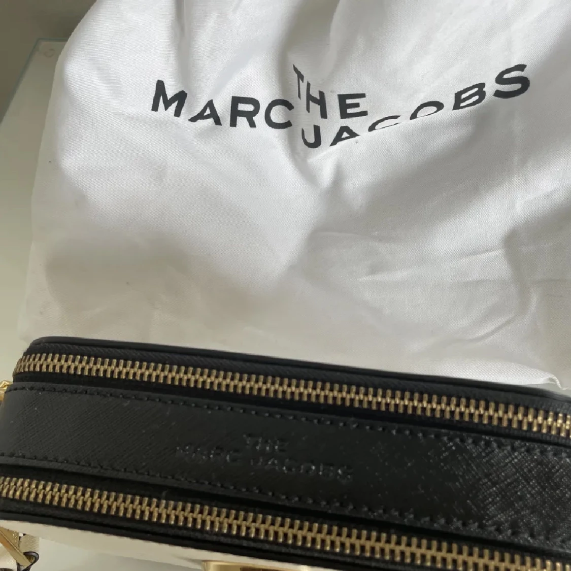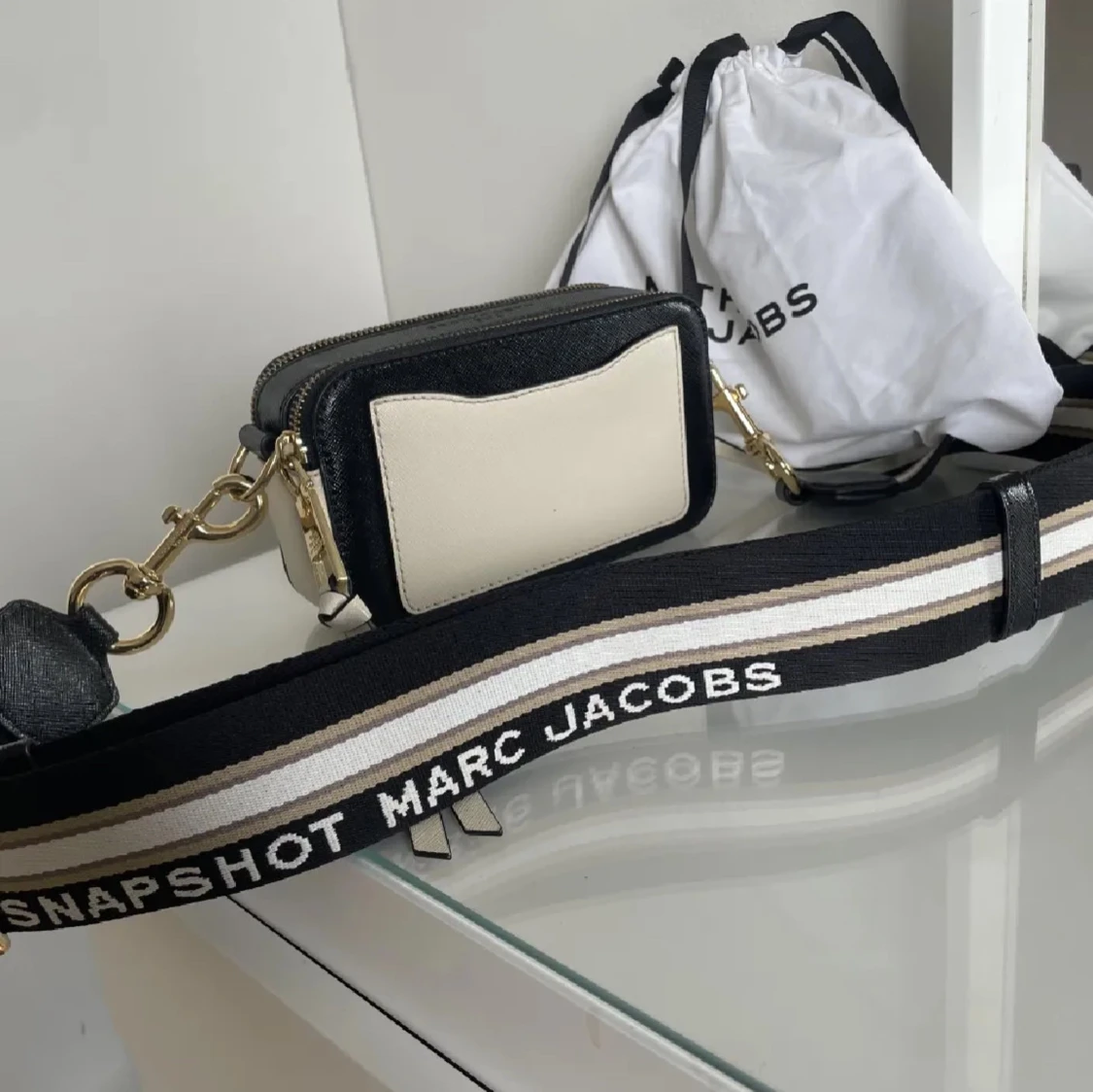 Snygg axelväska från Marc Jacobs i vit och svart med guldiga detaljer. Nyskick