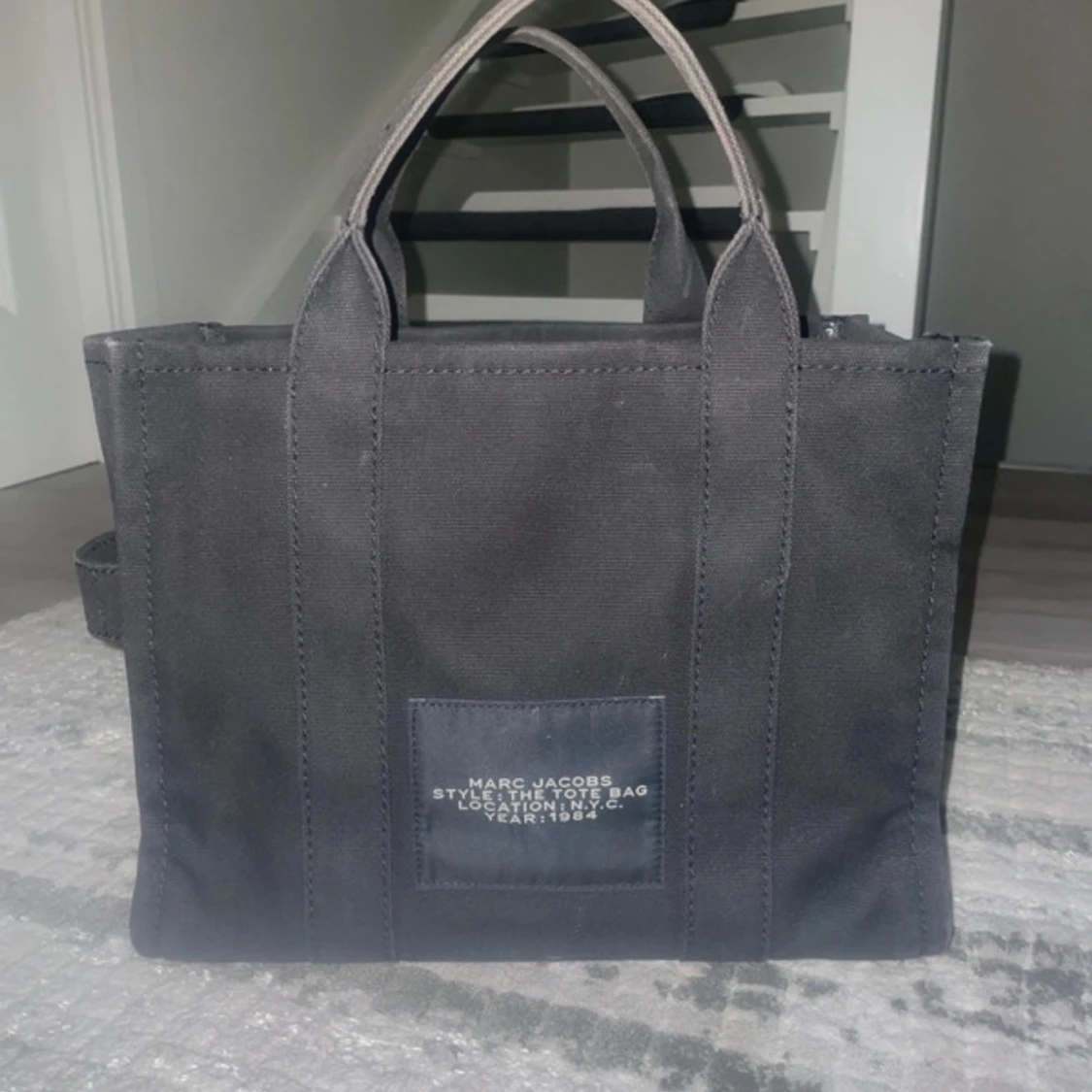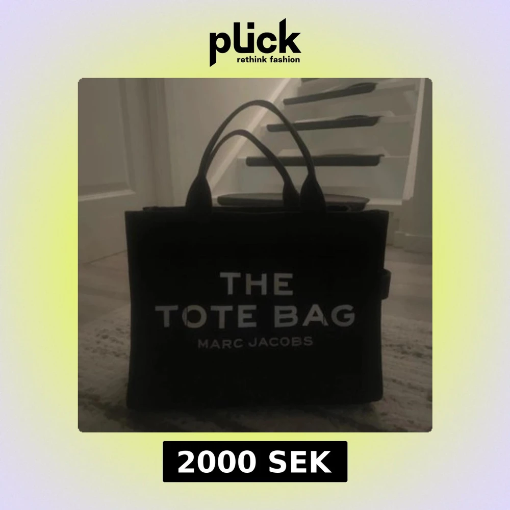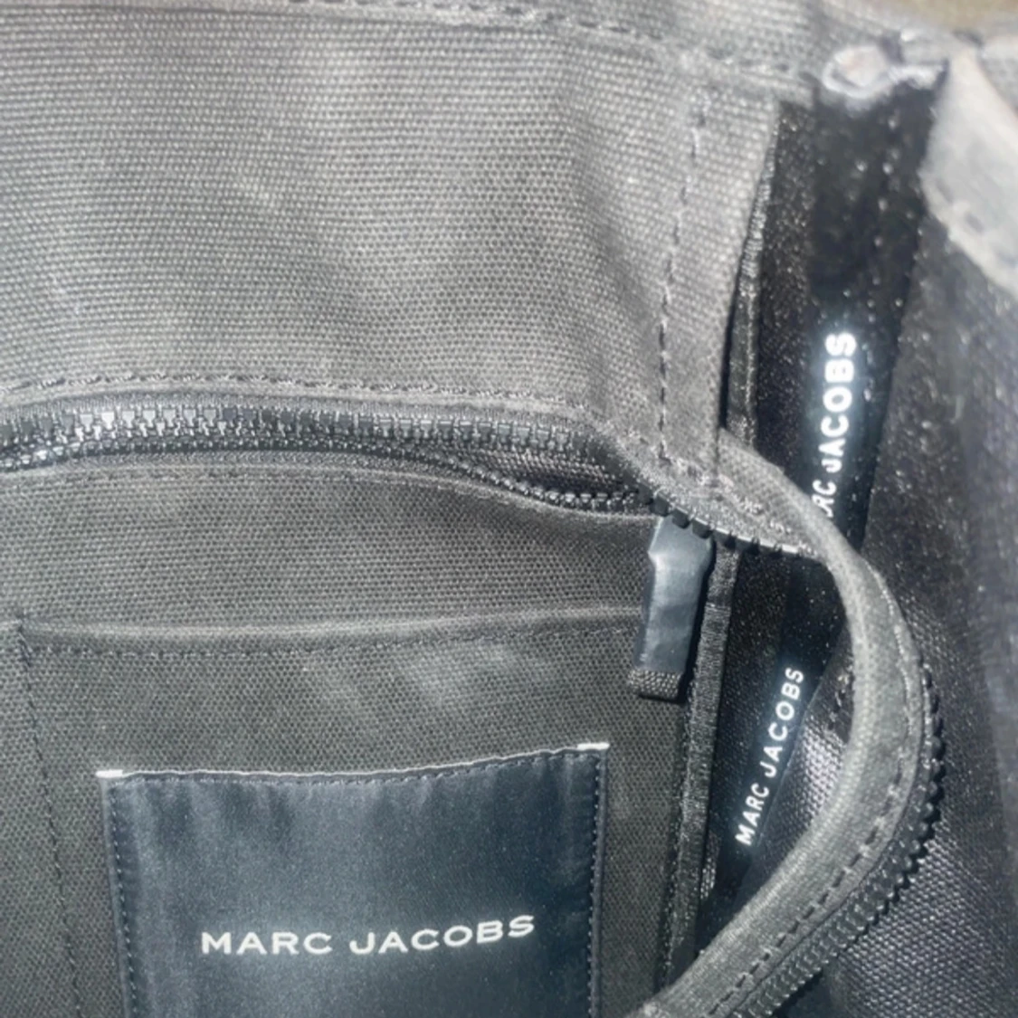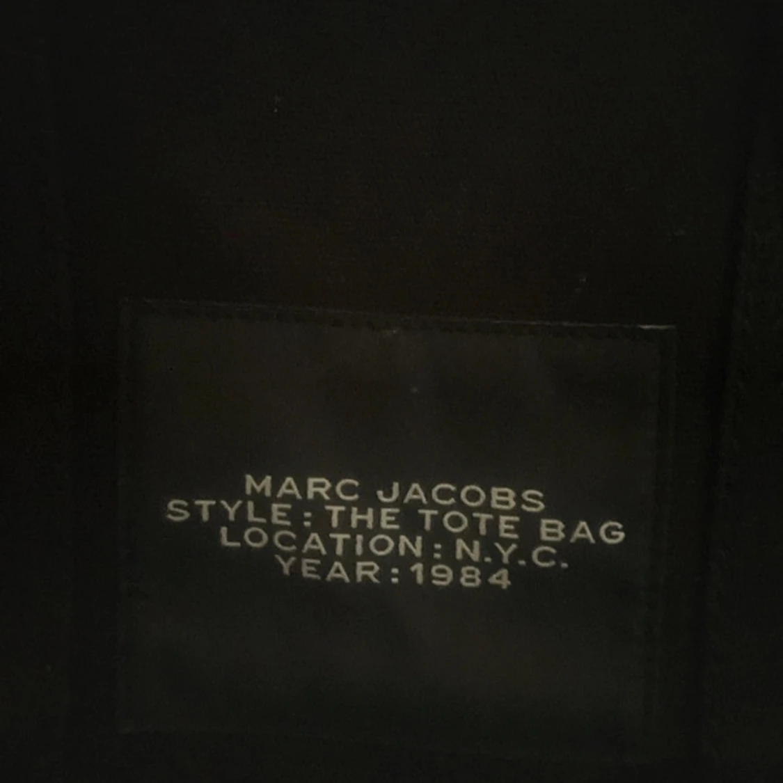 Snygg svart tote bag från Marc Jacobs med tydlig logga framtill och cool patch på baksidan. Väskan är fyrkantig med dubbla handtag och har en praktisk innerficka med dragkedja. Perfekt storlek för att få plats med allt du behöver.