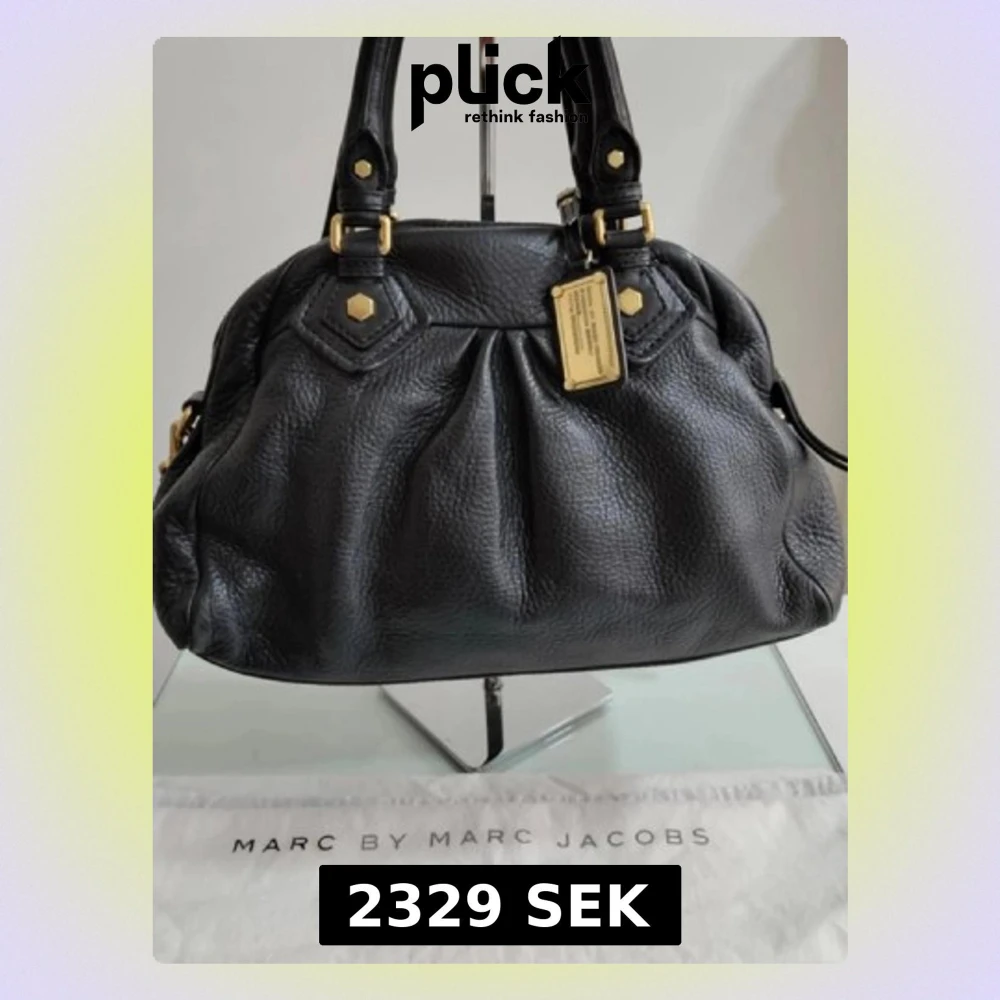 Säljer en snygg svart handväska från Marc by Marc Jacobs i mjukt skinn med guldfärgade metalldetaljer och dekorativ bricka framtill. Väskan har dubbla handtag och en klassisk, rundad form som ger en cool och tidlös vibe.