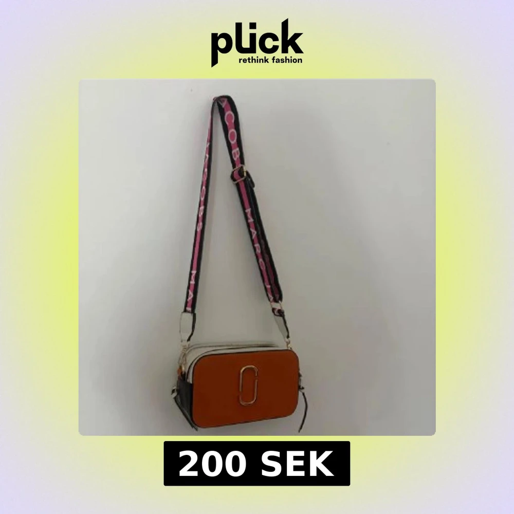 Snygg axelväska från Marc Jacobs i brunt, vitt och svart skinn. Väskan har två dragkedjor upptill och en bred axelrem med rosa och svart logotyp. Perfekt storlek för det viktigaste och en stilren metallogo framtill.