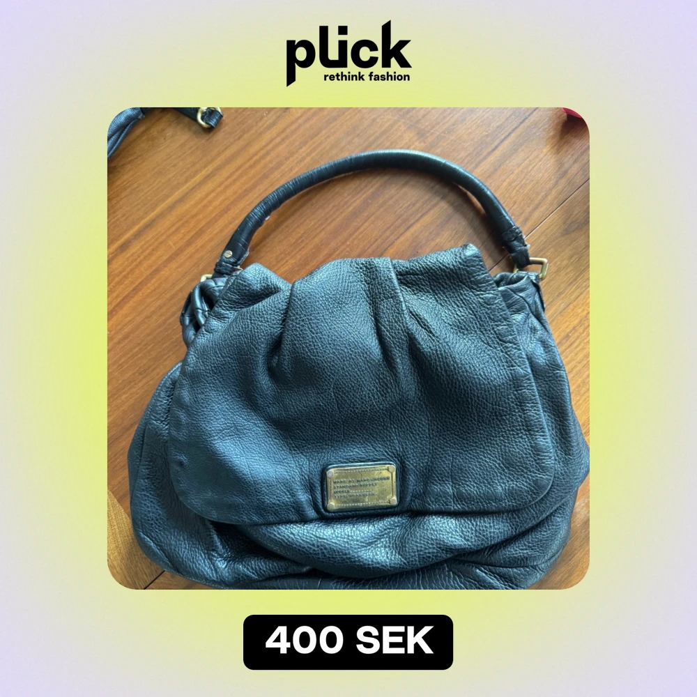 Säljer en snygg svart skinnväska från Marc by Marc Jacobs. Väskan har en stilren design med en metallplatta framtill och ett mönstrat foder. Insidan är tvättad men kommer inte bli vitare än på bild, men har tydliga spår av användning. Nött på metall och handtag men har mycket kvar att ge. Cirka 40 bred och 25 hög.