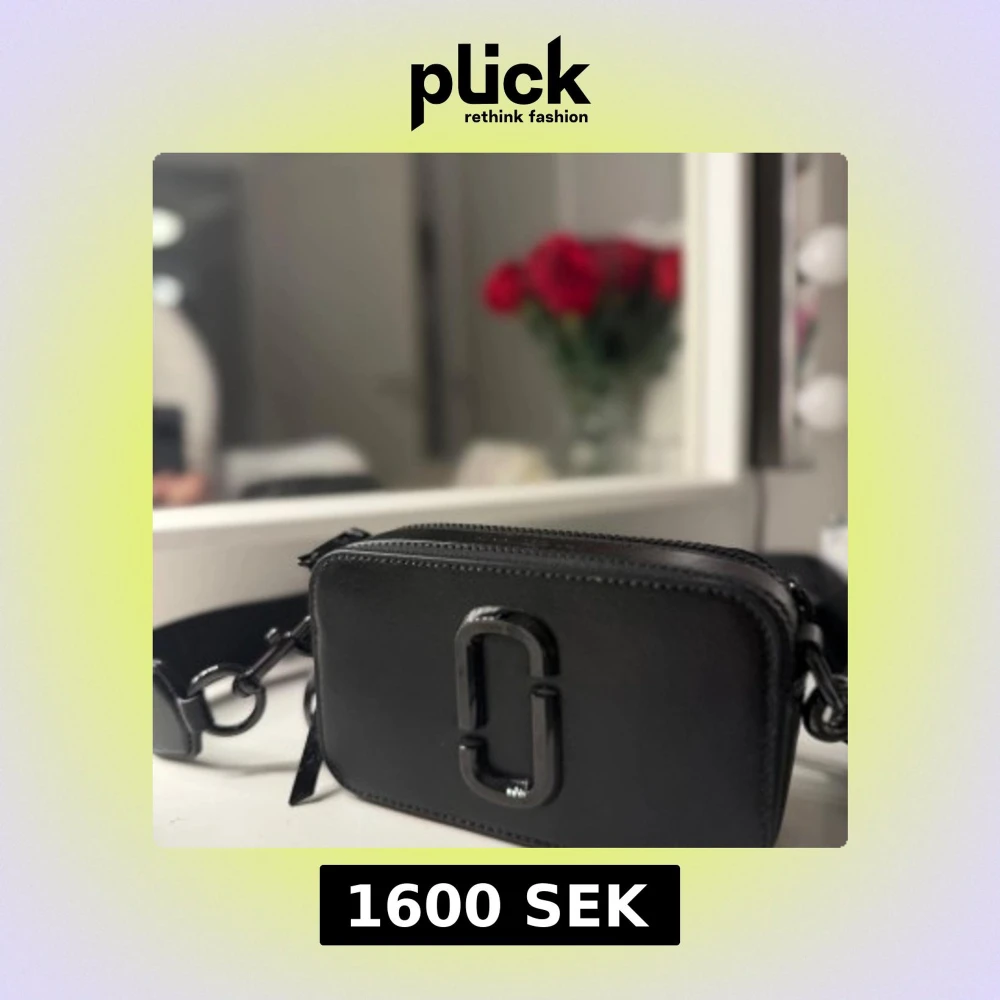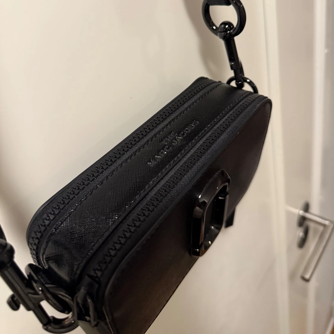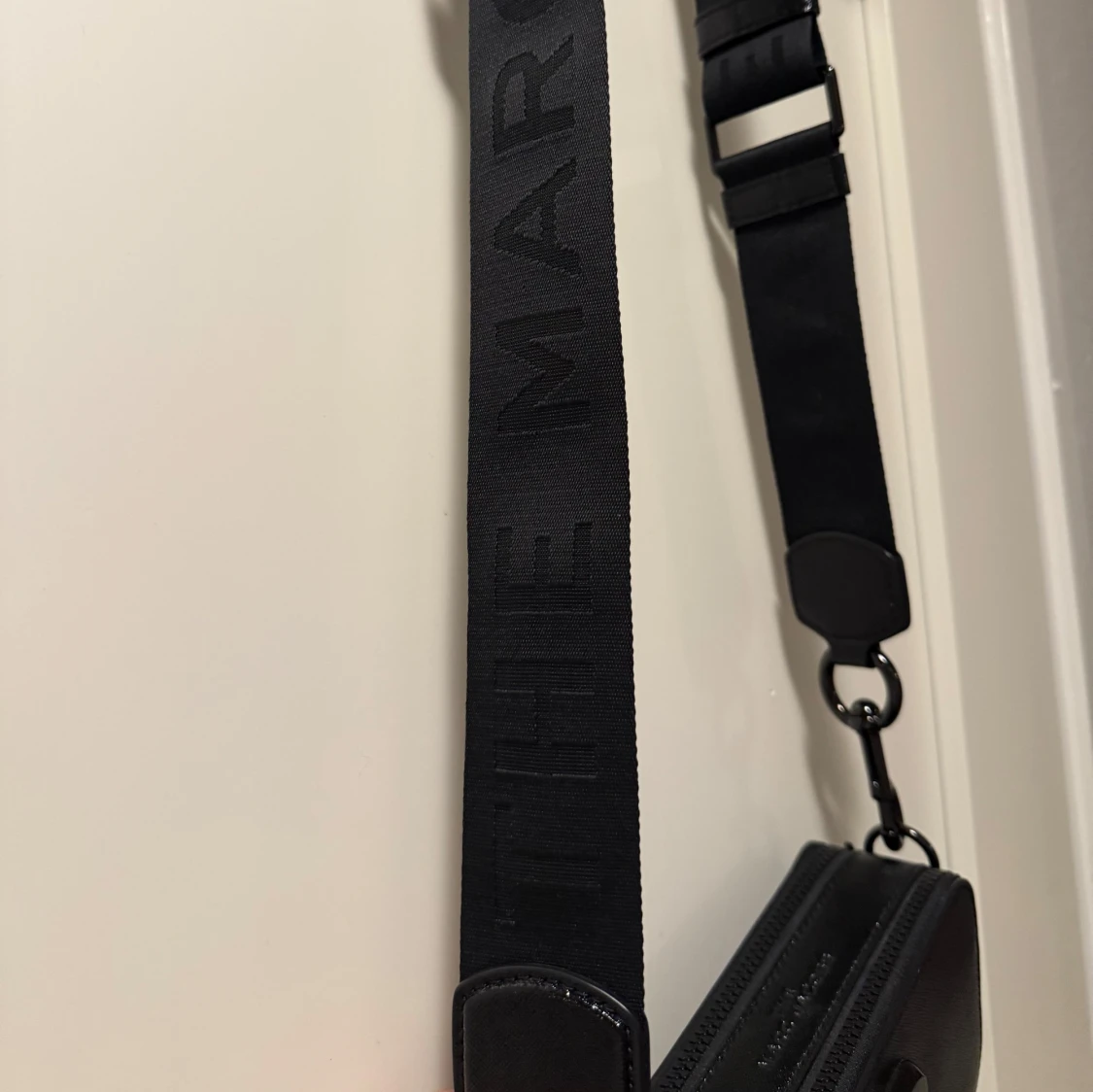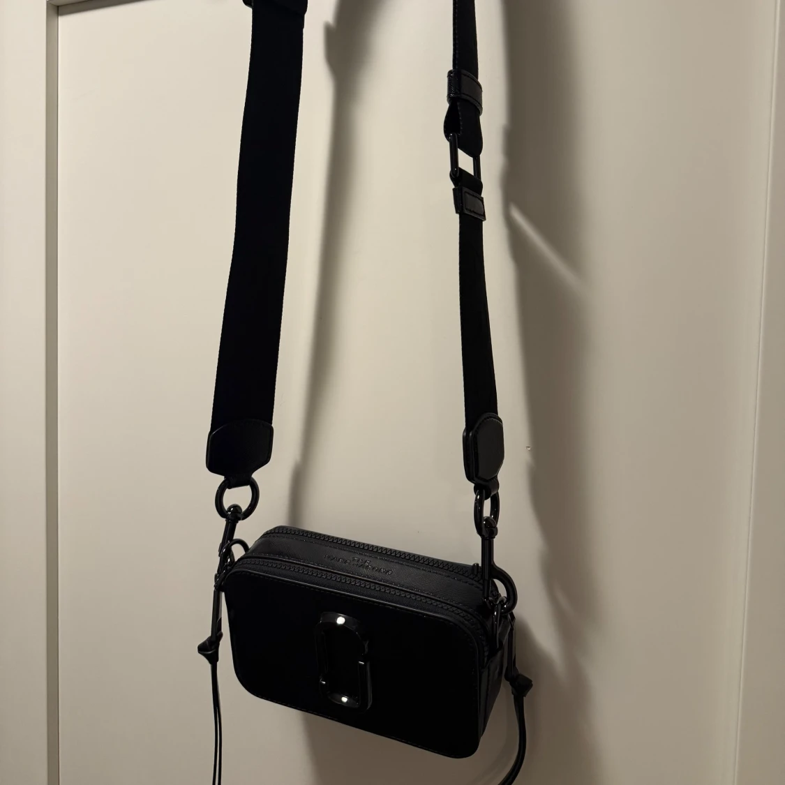 Säljer en svart axelväska från Marc Jacobs med bred justerbar axelrem och dekorativ logga framtill. Väskan har dragkedja upptill och är tillverkad i ett tåligt material med stilren design. Perfekt för att bära det viktigaste med stil.