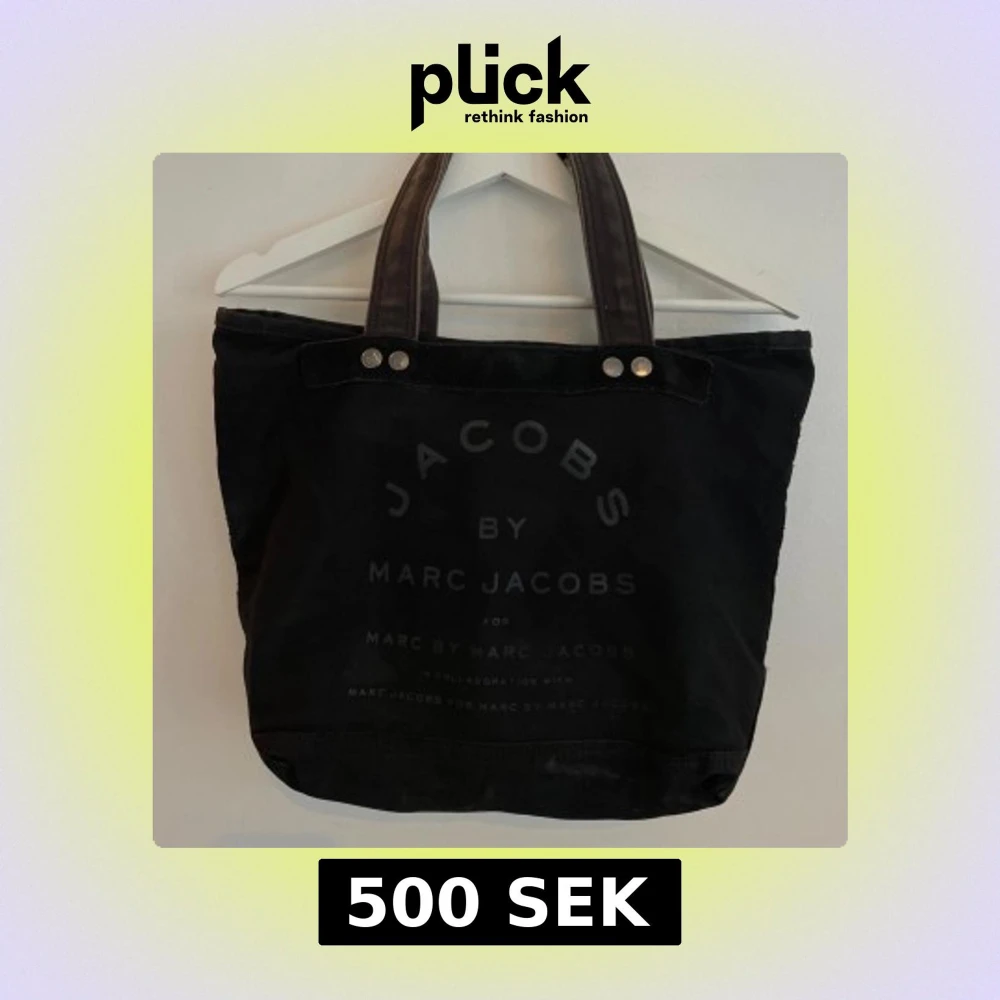 Stor svart shoppingväska från Marc Jacobs med tryckt logga på framsidan. Väskan har två rejäla handtag i mörkt material och detaljer med nitar. Tillverkad i manchester med stilren och enkel design, perfekt för att bära allt du behöver.
