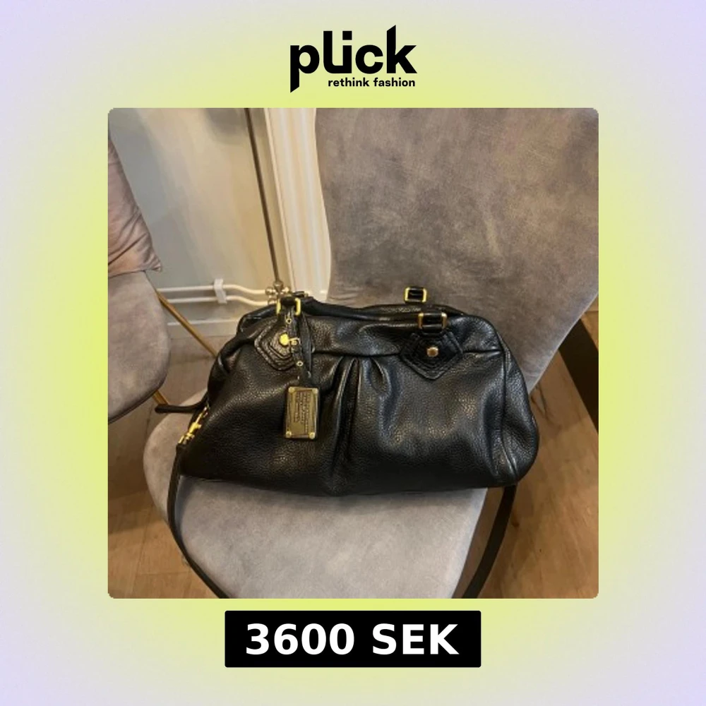 Säljer en svart axelväska från Marc by Marc Jacobs i mjukt, kornigt skinn. Väskan har guldfärgade metalldetaljer, dubbla handtag, avtagbar axelrem och dragkedja upptill. Klassisk och rymlig modell med snygg logoplatta framtill.
