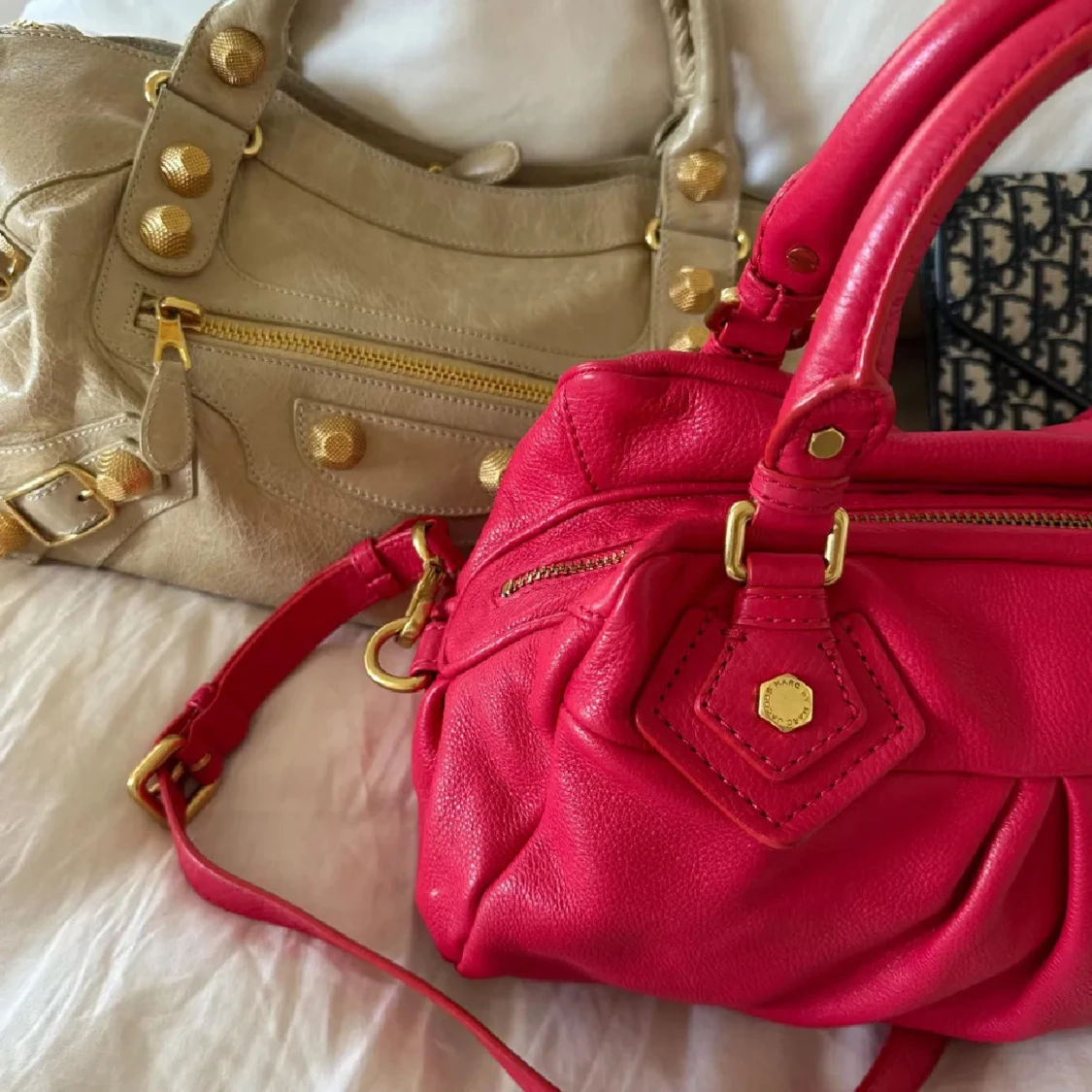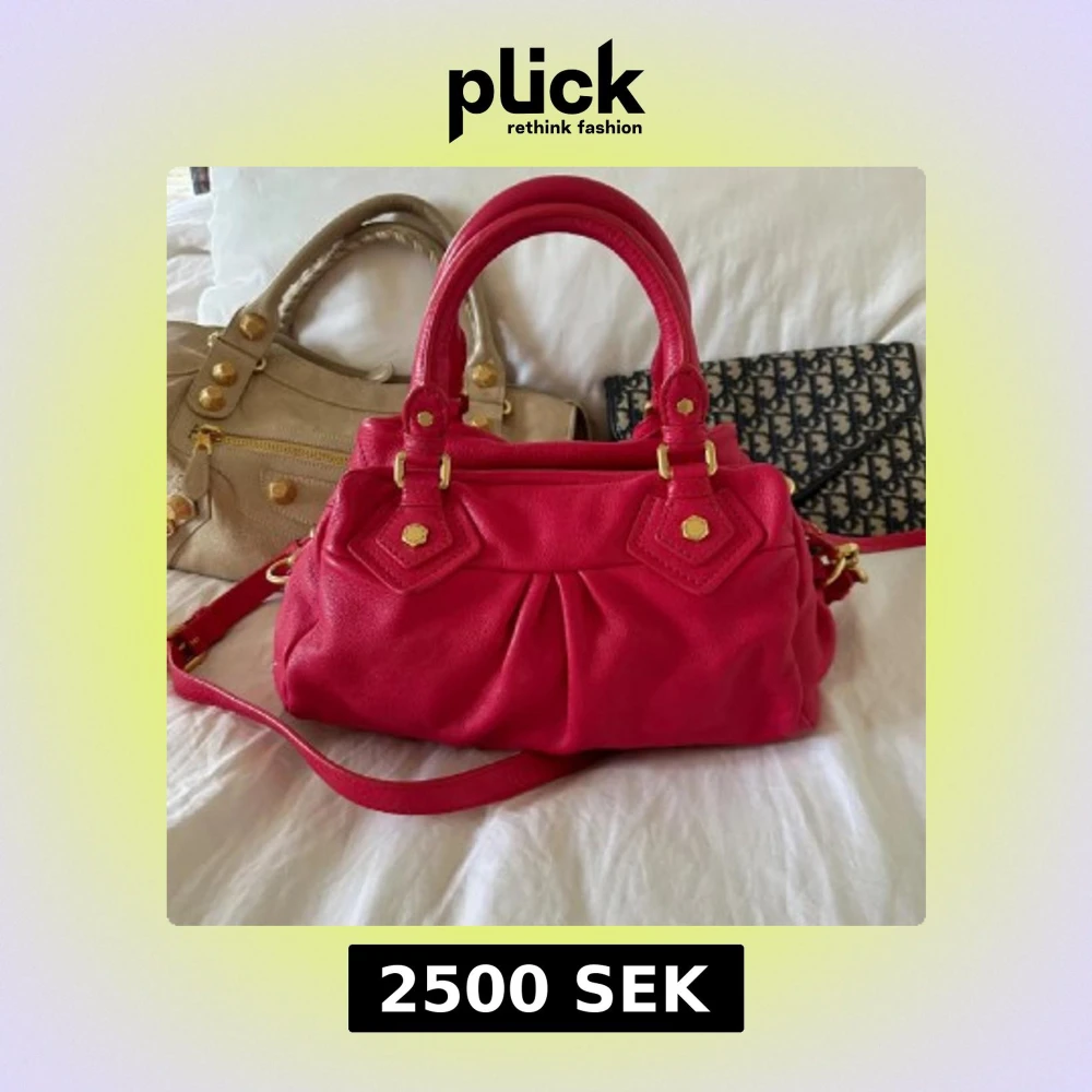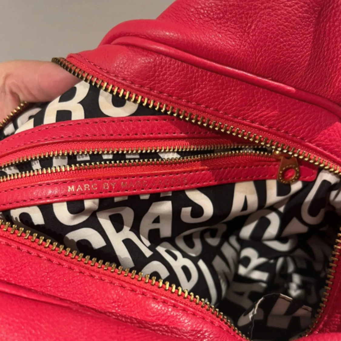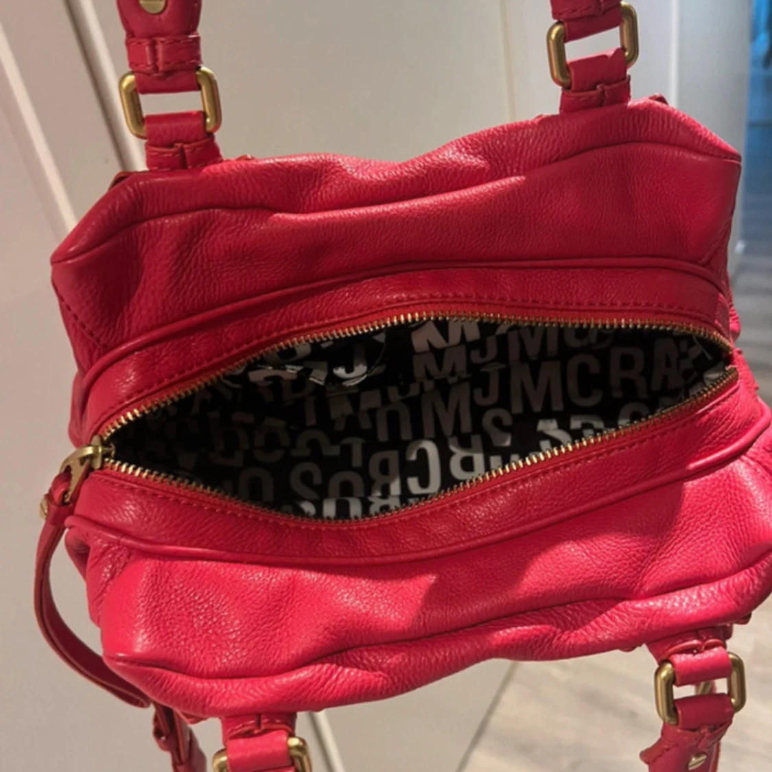 Cool röd handväska i skinn från Marc by Marc Jacobs med guldiga metalldetaljer och dragkedja. Väskan har både handtag och axelrem samt ett snyggt innerfoder med logotypmönster. Perfekt storlek för att få plats med allt du behöver.