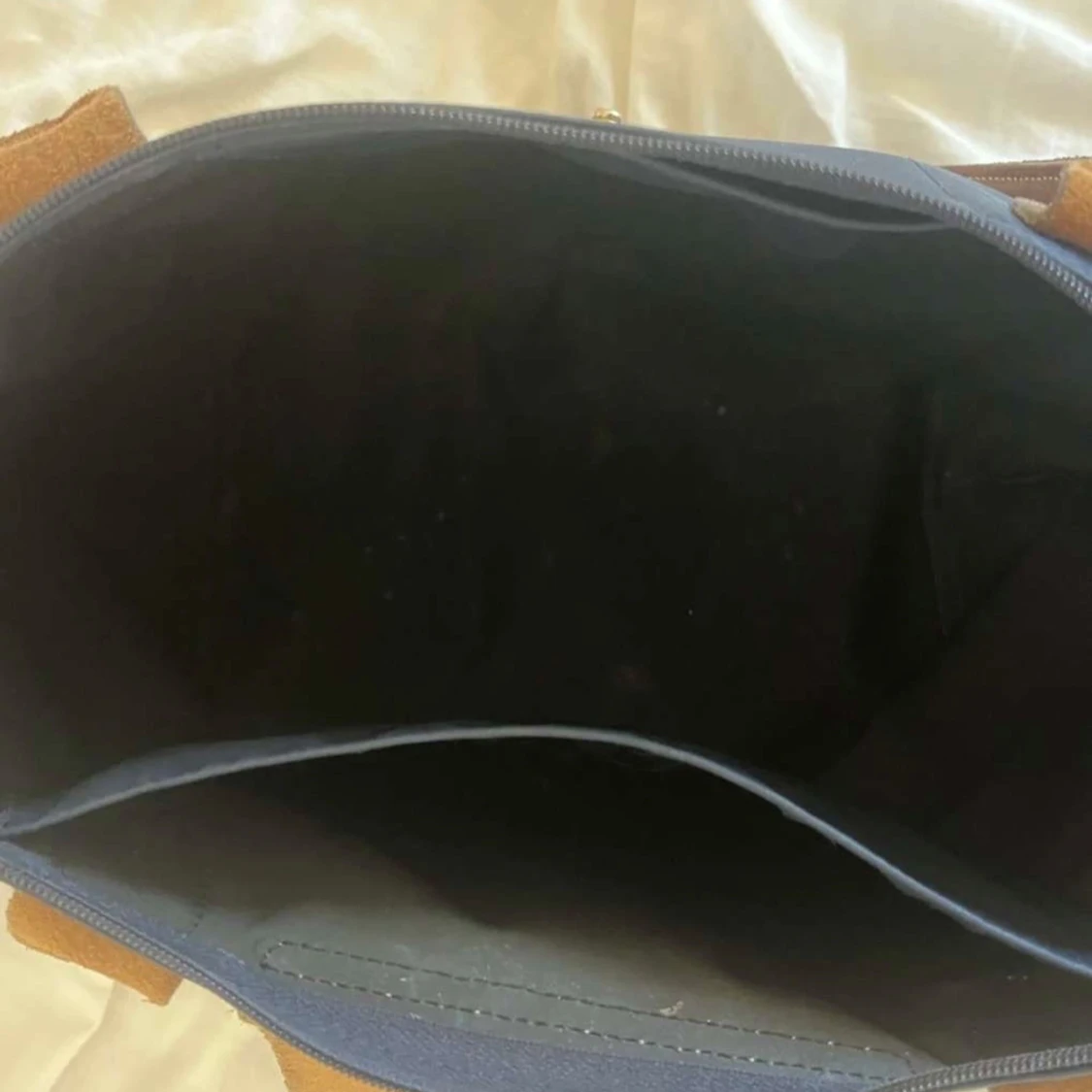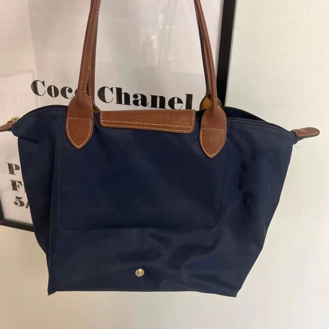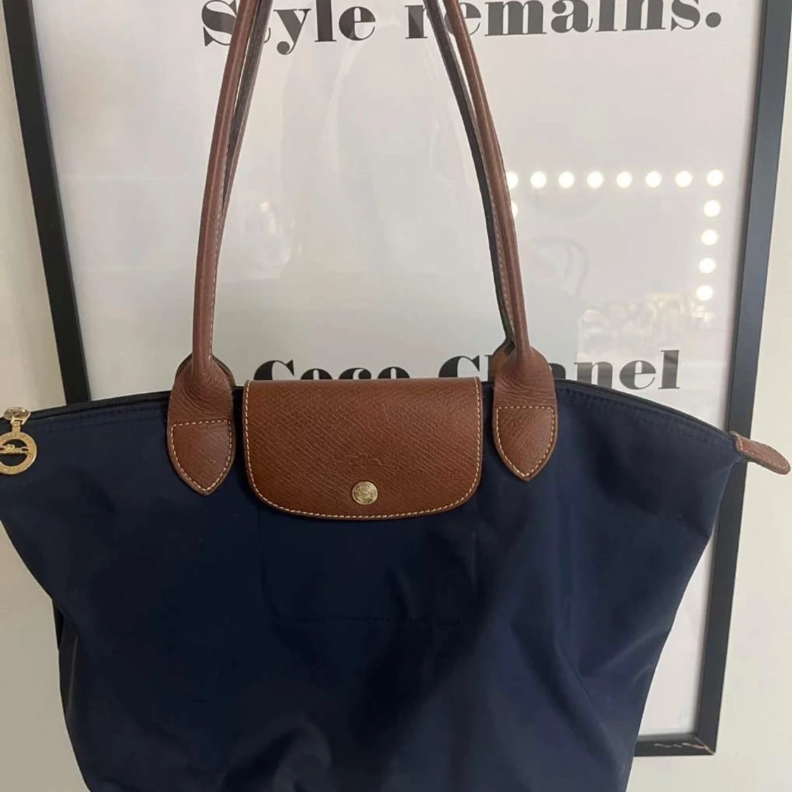 Säljer en klassisk marinblå axelväska från Longchamp med bruna skinnhandtag och detaljer. Väskan har dragkedja upptill och ett stort huvudfack. Perfekt storlek för att få plats med allt du behöver och stilren design som funkar till allt.