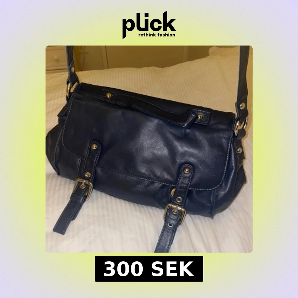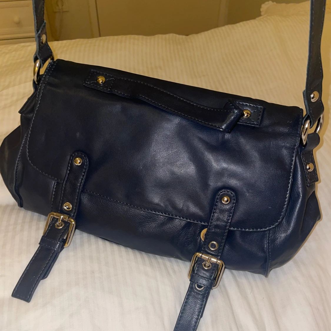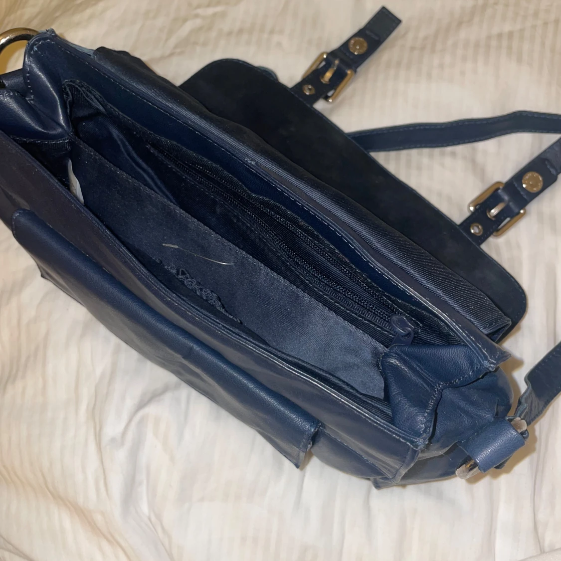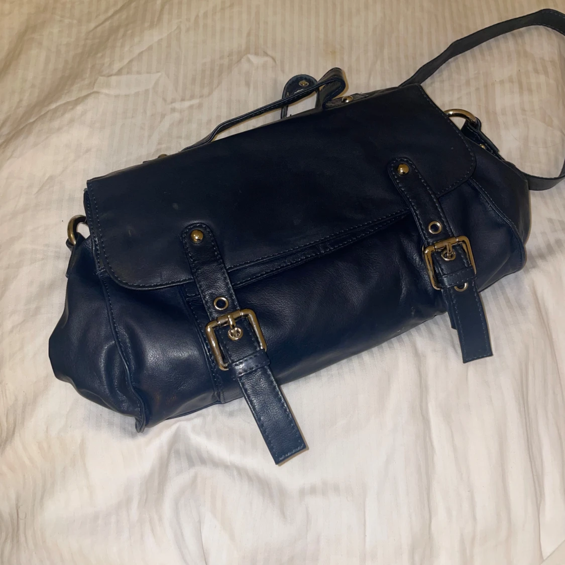 Snygg marinblå axelväska med spännen och dragkedja. Väskan har en praktisk storlek och justerbar axelrem. Endast använd ca två gånger
