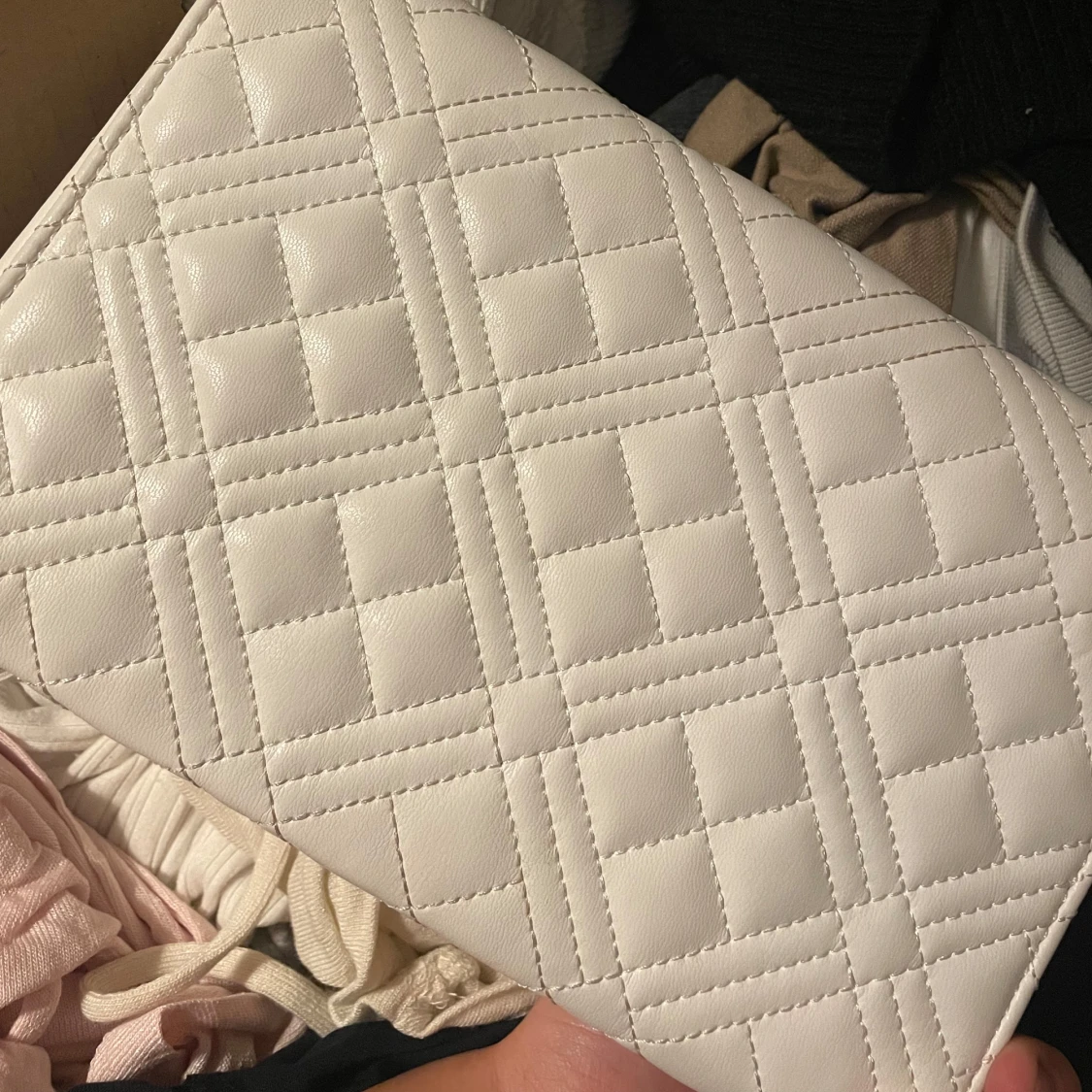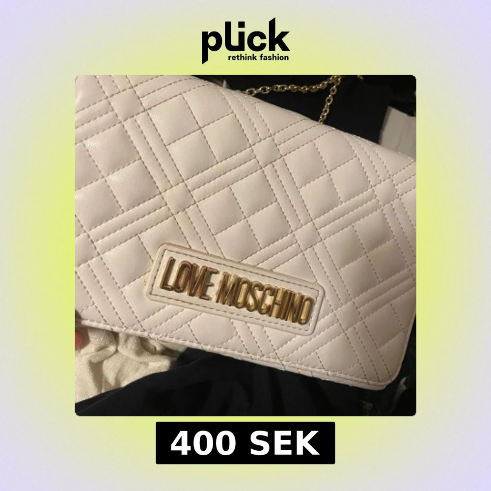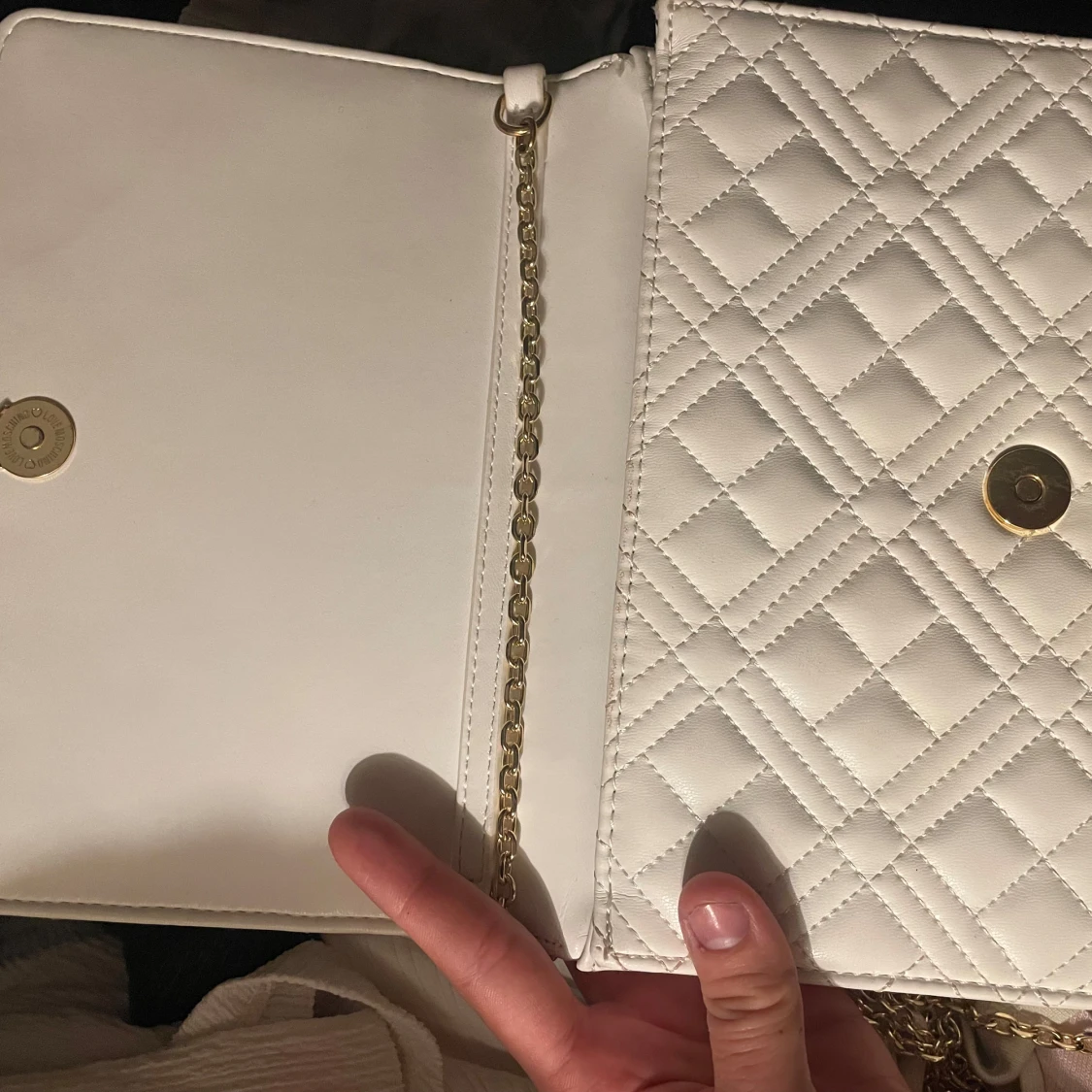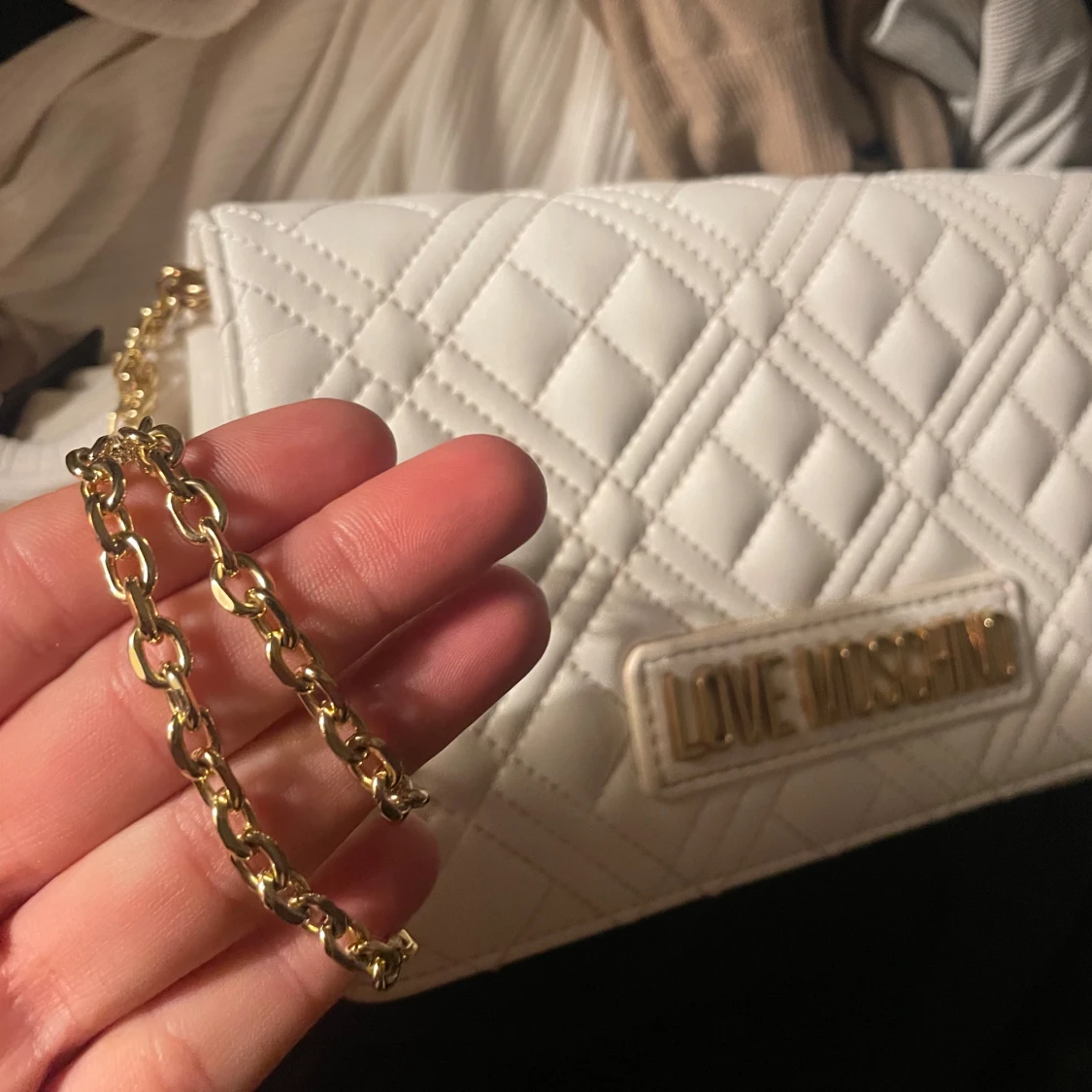 Supersnygg vit quiltad axelväska från Love Moschino med guldfärgad kedja och logga framtill. Väskan har ett elegant rutmönster och stängs med magnetknapp. Perfekt för dig som vill ha en stilren och trendig accessoar.