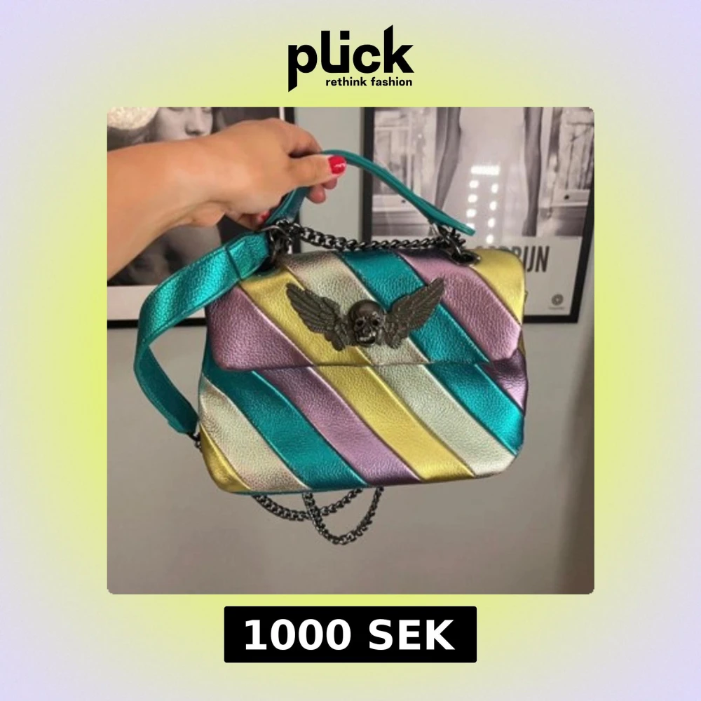 Färgglad väska i metallic skinn med breda diagonala ränder i turkos, lila, gul och silver. Väskan har en cool dödskalle med vingar i metall framtill, kedjeaxelrem och ett handtag i turkos. Perfekt statement piece för dig som gillar att sticka ut.