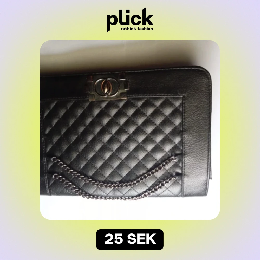 Säljer en snygg svart handväska i skinn med quiltat mönster. Väskan har en elegant kedjedetalj och en praktisk dragkedja. Perfekt för både vardag och fest!