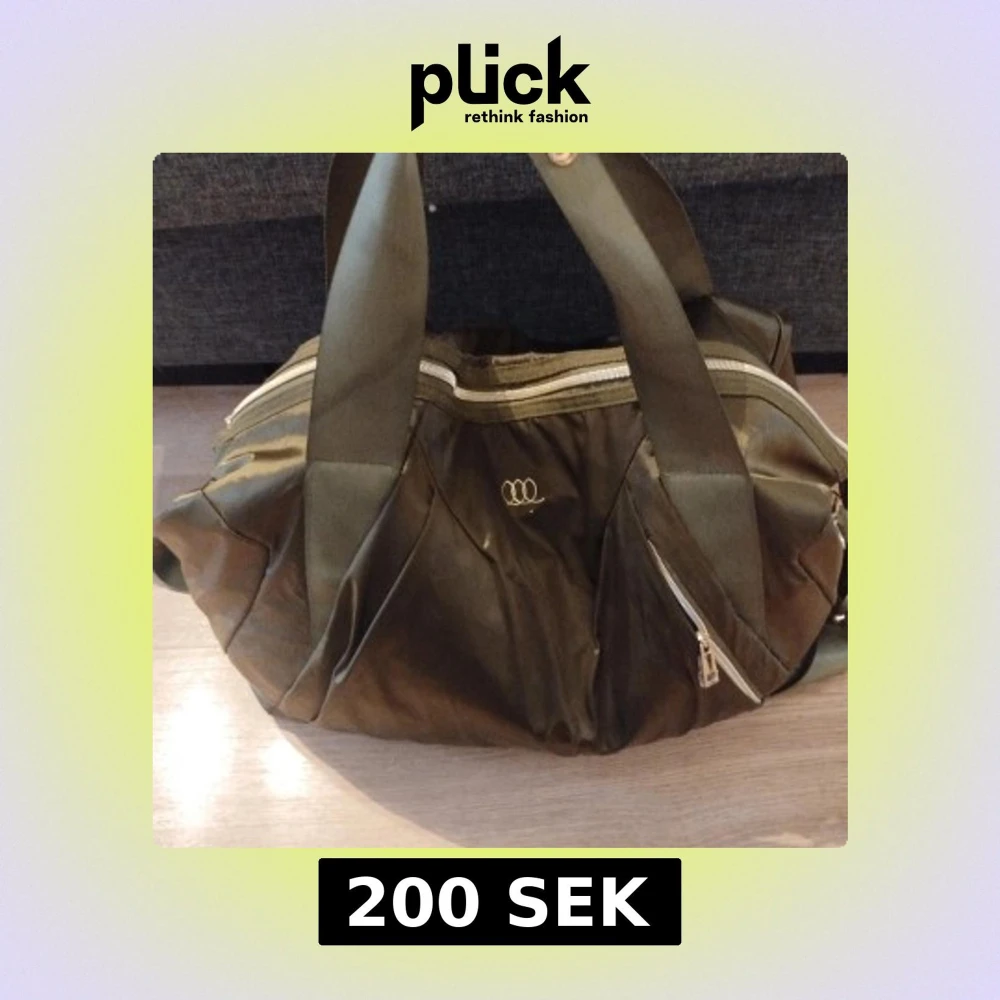 Säljer en olivgrön axelväska från Rituals med breda handtag och justerbar axelrem. Väskan har dragkedja upptill, guldfärgade detaljer och en diskret logga framtill. Perfekt för gymmet eller som yogabag då mattan är perfekt att knäppa fast ovanpå väskan.