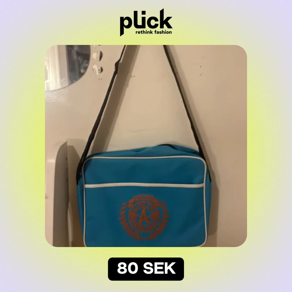 Blå Väska med stor ficka på framsidan och två mindre på insidan Rektangulär i formen Lätt att packa saker i Säljs för att jag inte använder den