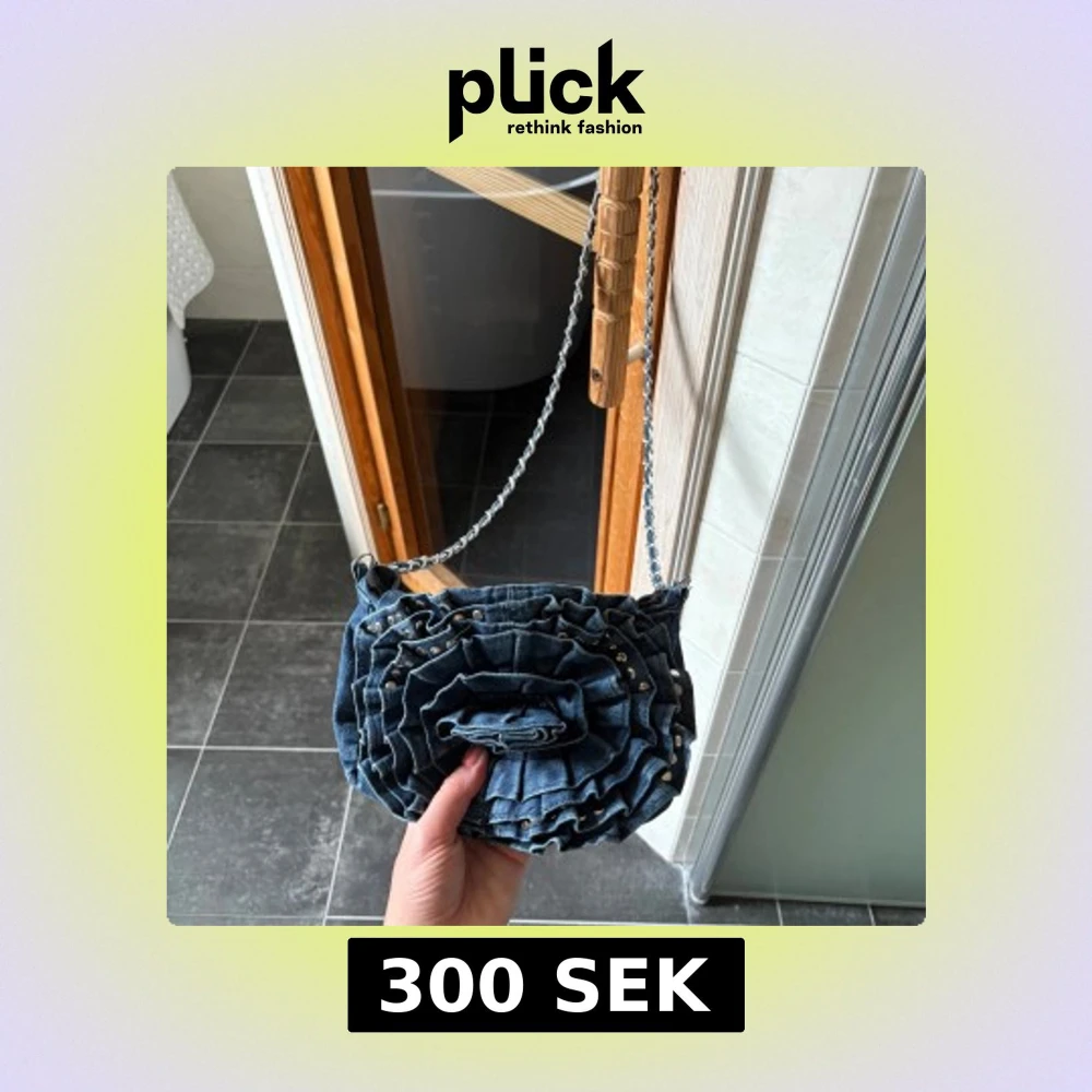 Säljer en unik axelväska i jeansmaterial med volangdetaljer framtill och små silvriga nitar. Väskan har en kedjerem som axelband och stängs med magnetknapp. Perfekt för dig som vill sticka ut med en cool och trendig accessoar.