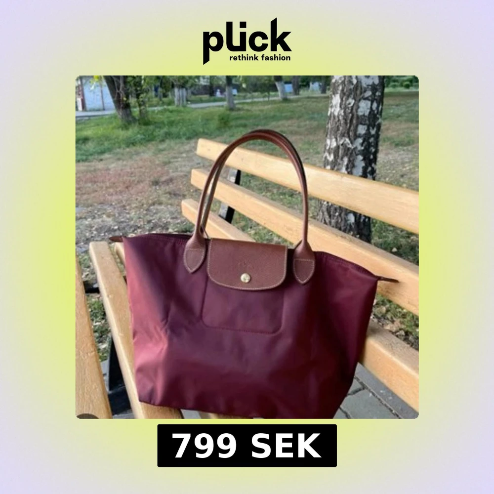 Stilren vinröd handväska från Longchamp med bruna skinnhandtag och lock. Väskan har en klassisk, rymlig form och är tillverkad i slitstark syntet med detaljer i skinn. Perfekt för dig som vill ha en snygg och praktisk väska med ikonisk design. Knappt använd