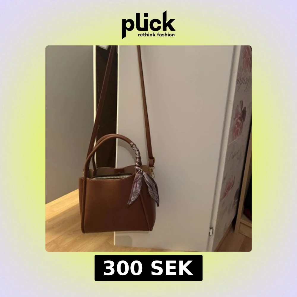 Snygg brun axelväska i skinn med en randig knytrosett på handtaget. Väskan har en praktisk dragkedja och en justerbar axelrem. Använd endast två gånger. Lagom stor, får plats med hyfsat mycket. Köptes för 500
