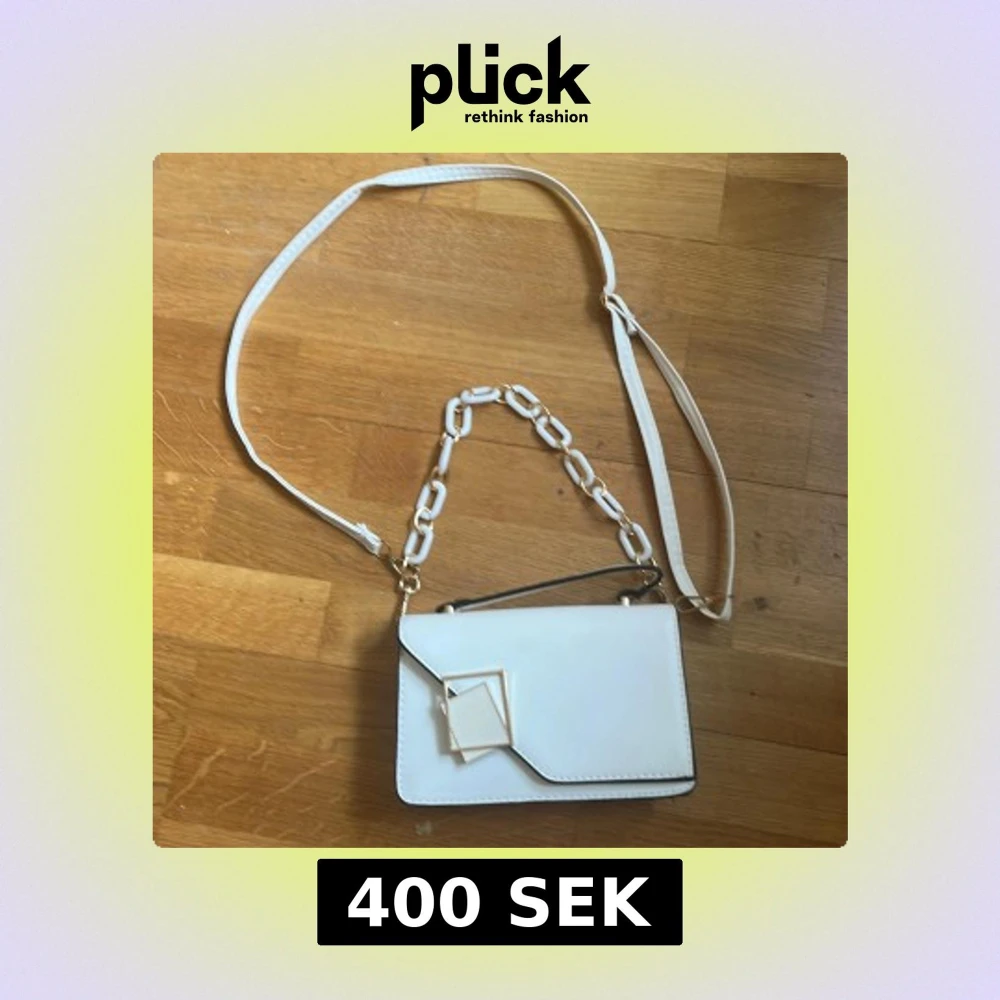 Snygg vit axelväska med justerbart axelband och dekorativ kedja i plast. Väskan har ett geometriskt spänne i guld och magnetlås. Insidan har ett fack med dragkedja. Perfekt för att lyfta din outfit!