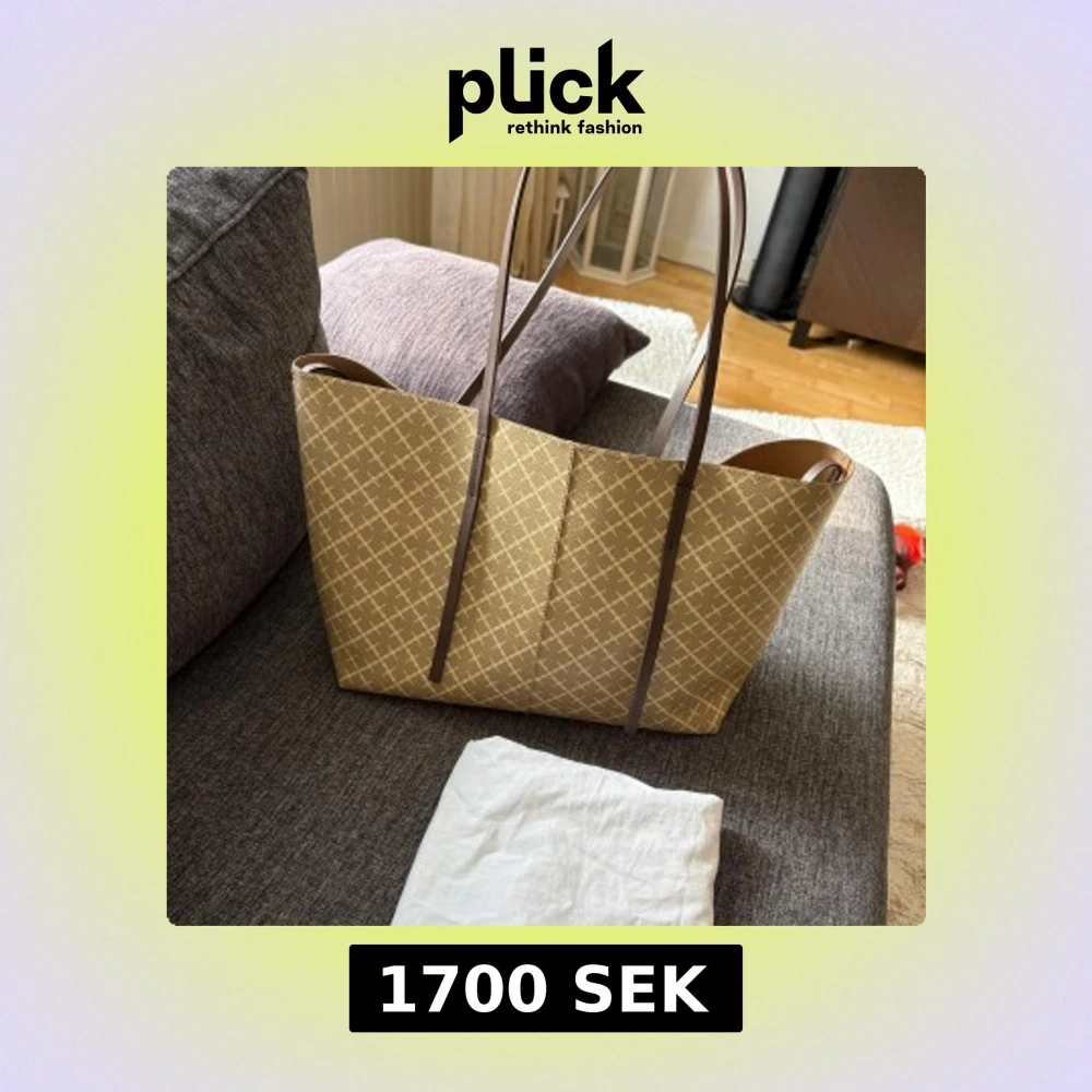 Stilren shoppingväska i beige med rutigt mönster och långa bruna handtag. Väskan är rymlig och har en innerficka i samma mönster. Materialet är syntet med detaljer i brunt, perfekt för dig som vill ha en snygg och praktisk väska till vardagen.BUDA gärna