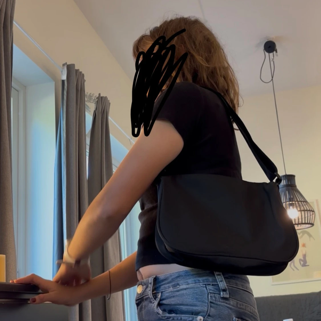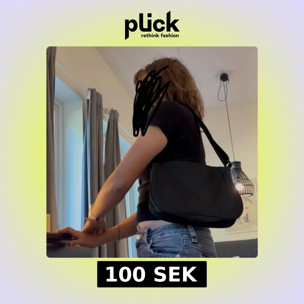 Snygg svart axelväska med justerbart band och enkel, stilren design. Väskan är tillverkad i slätt syntetmaterial och har en mjuk, rundad form. Perfekt storlek för att bära med sig det viktigaste och passar till många olika outfits.