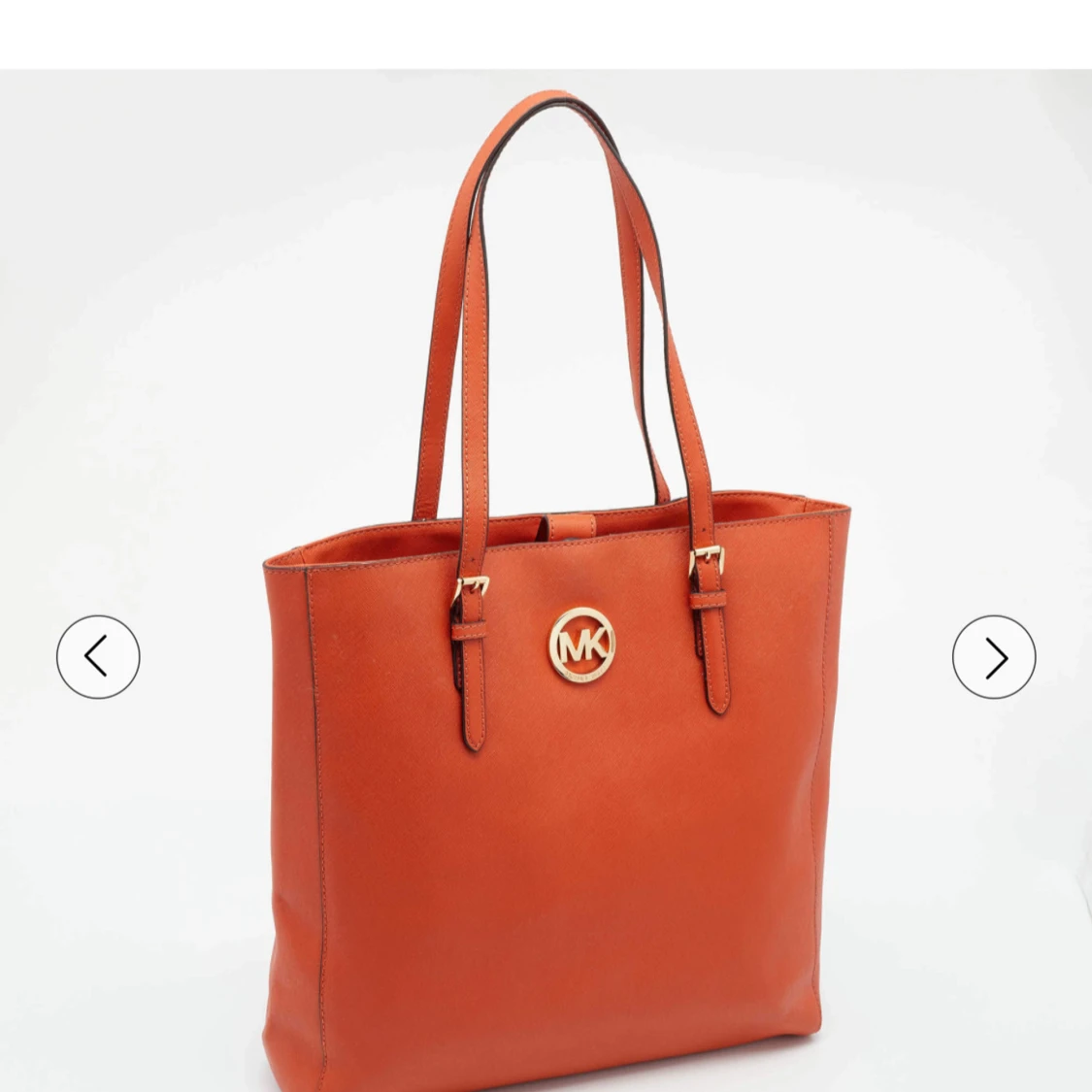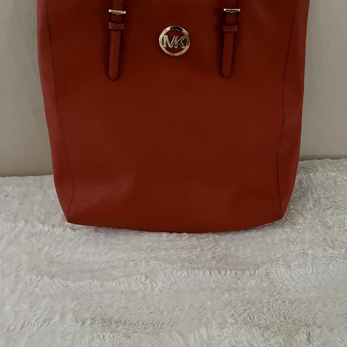 Snygg orange axelväska från Michael Kors i slätt skinn med guldfärgat MK-emblem framtill. Väskan har raka linjer, två långa axelremmar och rymligt innerfack. Perfekt för dig som vill ha plats för allt och samtidigt hålla stilen.
